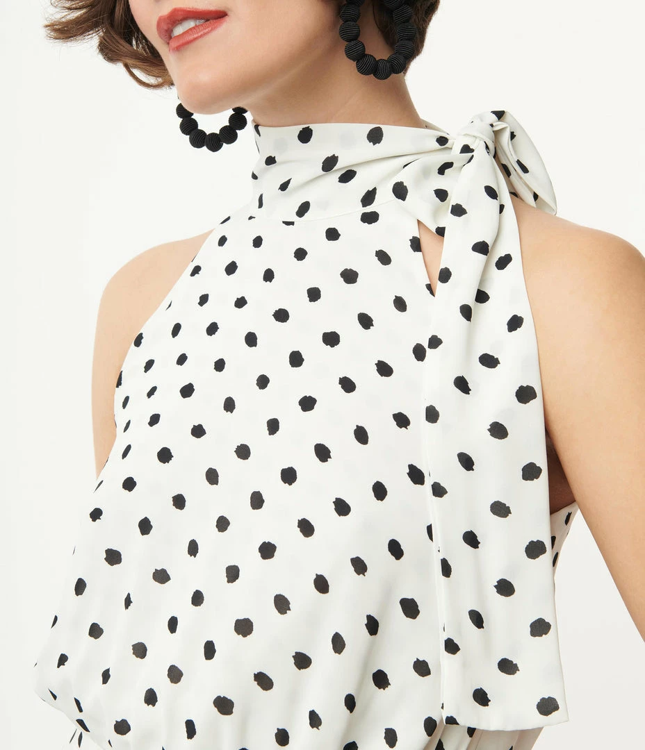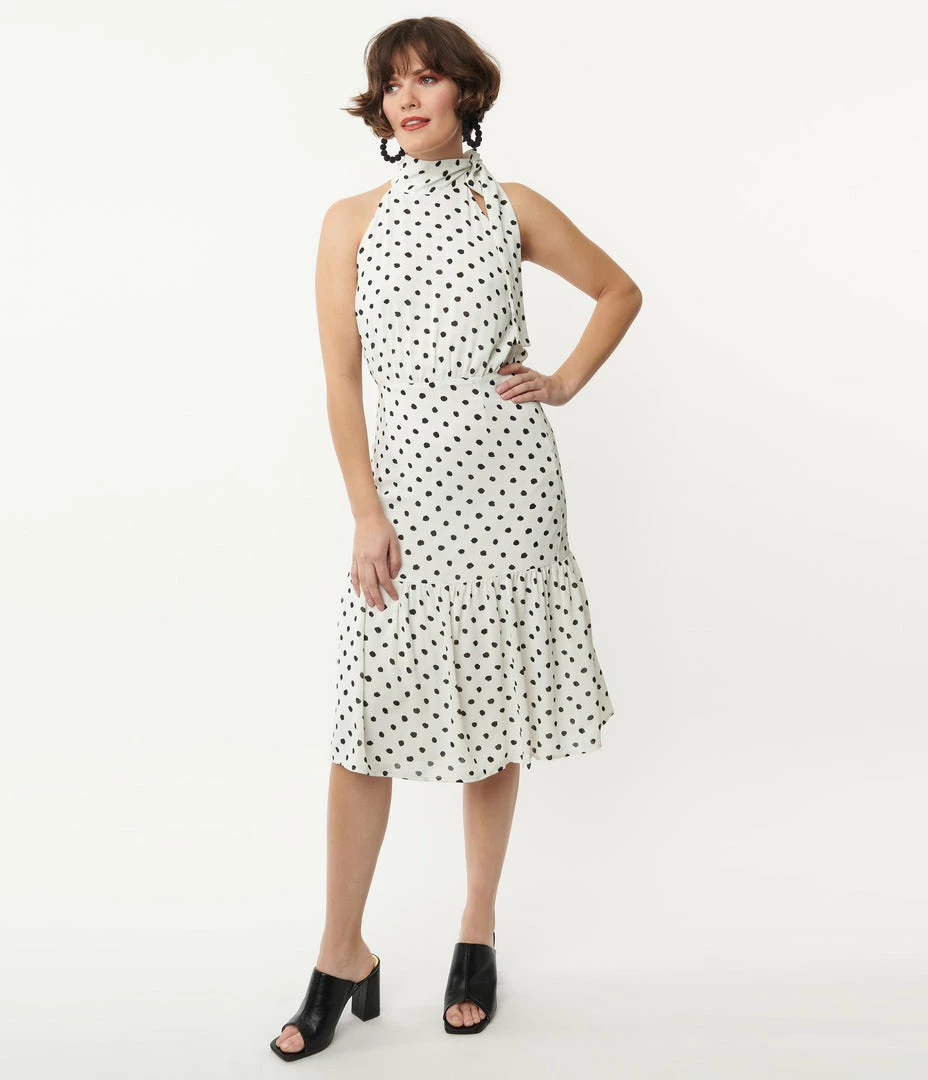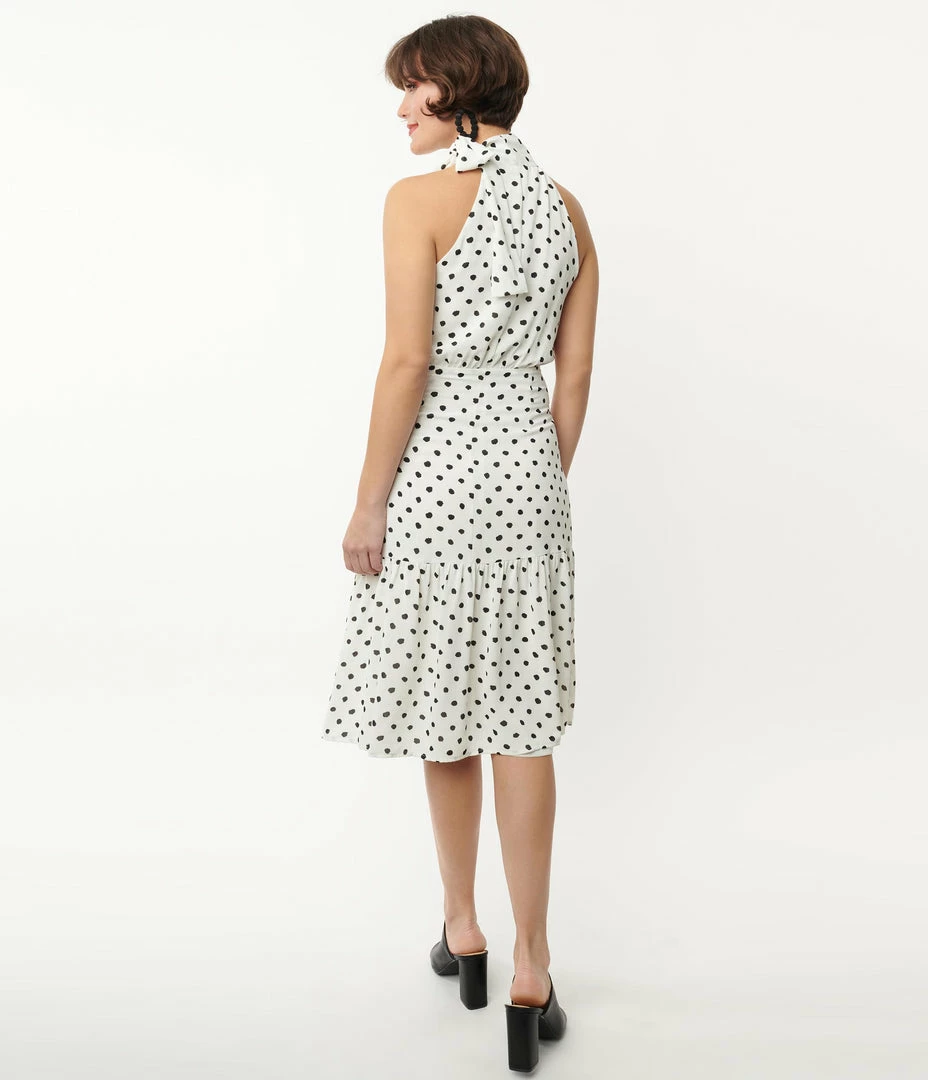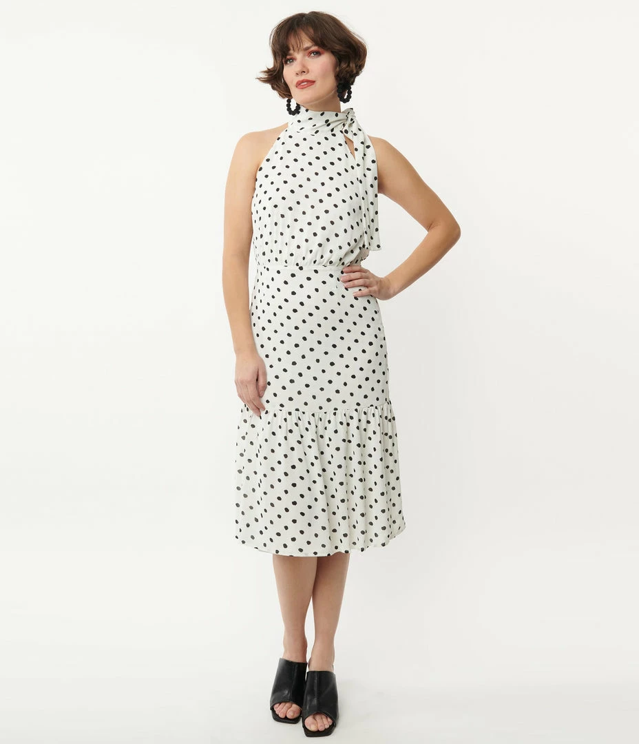 Dotted divinity, dames! This sweet and lightweight midi dress is a vintage dream with black polka dots printed throughout the white backdrop. The elegant high neckline is embellished by a self tie halter that lends the dramatic bow. The seamed waist is cinched with a side zipper while the playful midi skirt drops to a ruffle border hem!