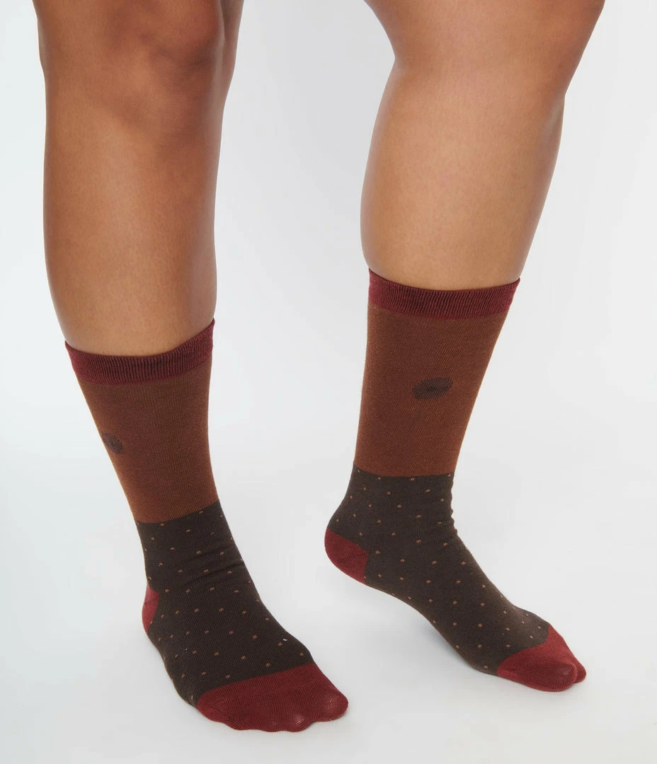This fun and comfy pair of socks is cast in brown cotton blend, featuring a nipple, and polka dots!