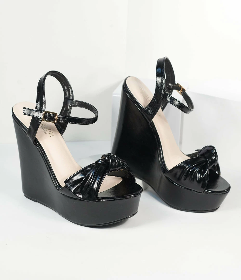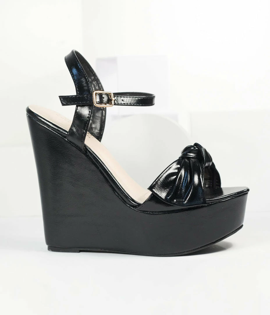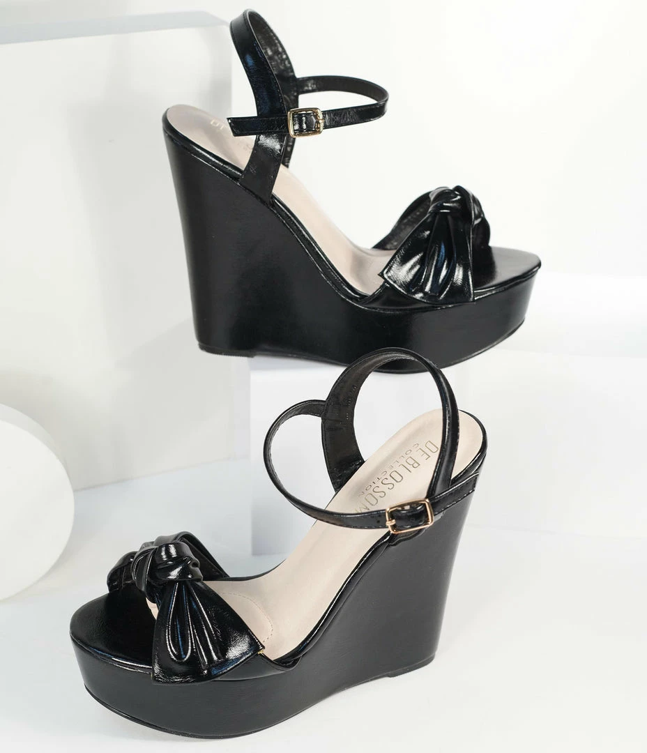 Make your flirtation dramatic with these marvelous platform wedges, crafted in black leatherette, the dainty peep toe is embellished with a bow accent. The stunning 2 inch platform and 5.5 inch heel are secured with a gored and adjustable ankle straps, complete with a cushion insole!