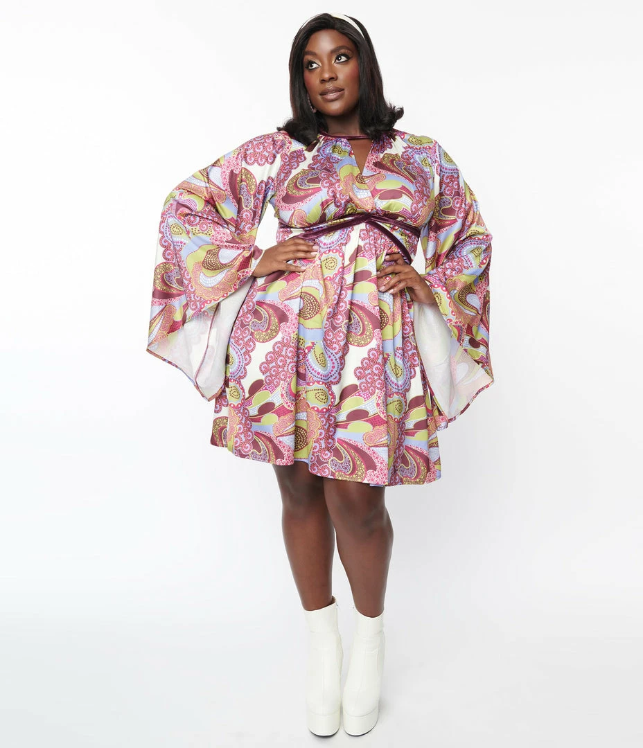 This dazzling dress is a retro treat, cast in chiffon that dances with an abstract paisley print in shades of purple, green, pink, and cream. The surplice bodice is trimmed at the collar in purple velvet creating a sultry keyhole that is framed by dramatic bell sleeves. Complete with a back zipper.