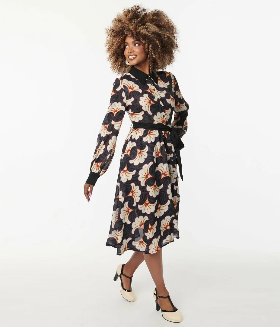 Deals ๐ Trending Unique Vintage Black & Ivory Deco Floral ๐ Shirtdress ๐
