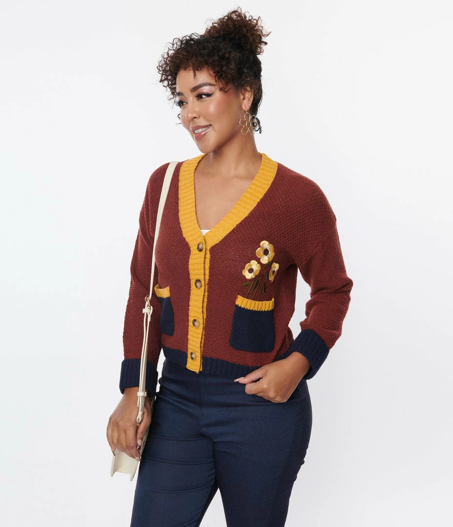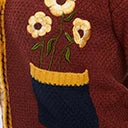 This charming cardigan is crafted in brown knit and highlighted with a mustard yellow and navy blue. The button up front is complete with side pockets and an embroidered set of florals.