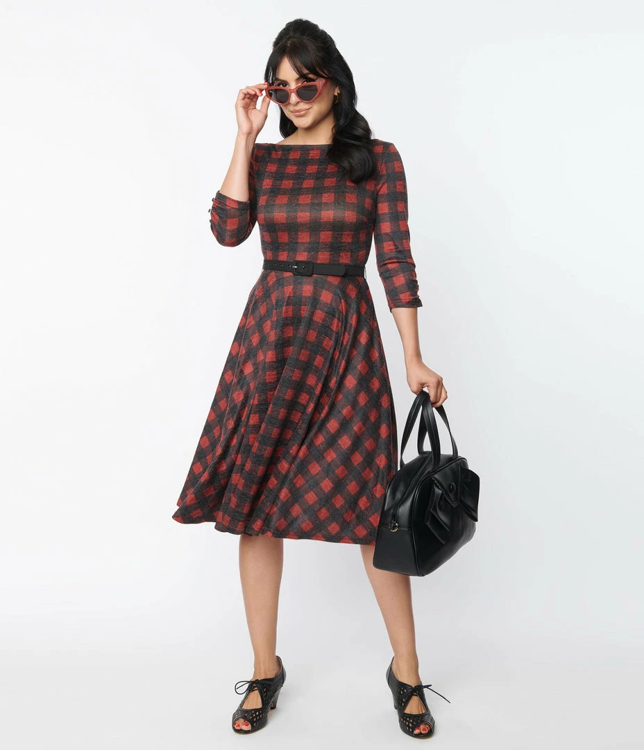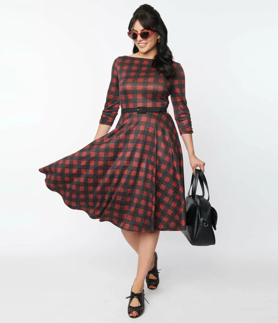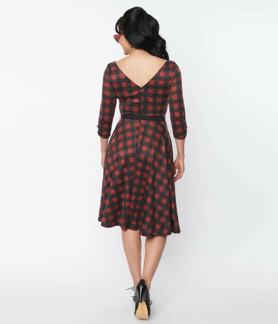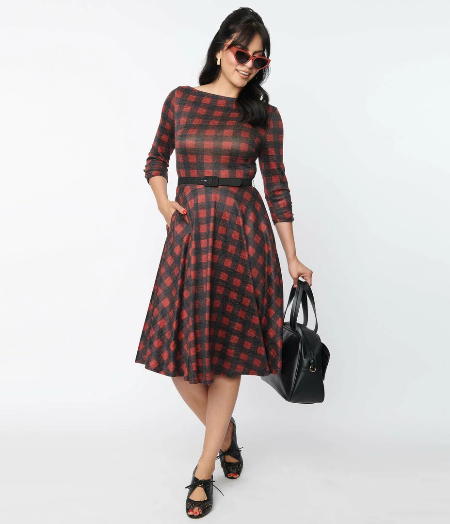New 🌟 Trending Unique Vintage Burgundy & Black Buffalo Plaid Knit Devon Swing 👗 Dress 👏