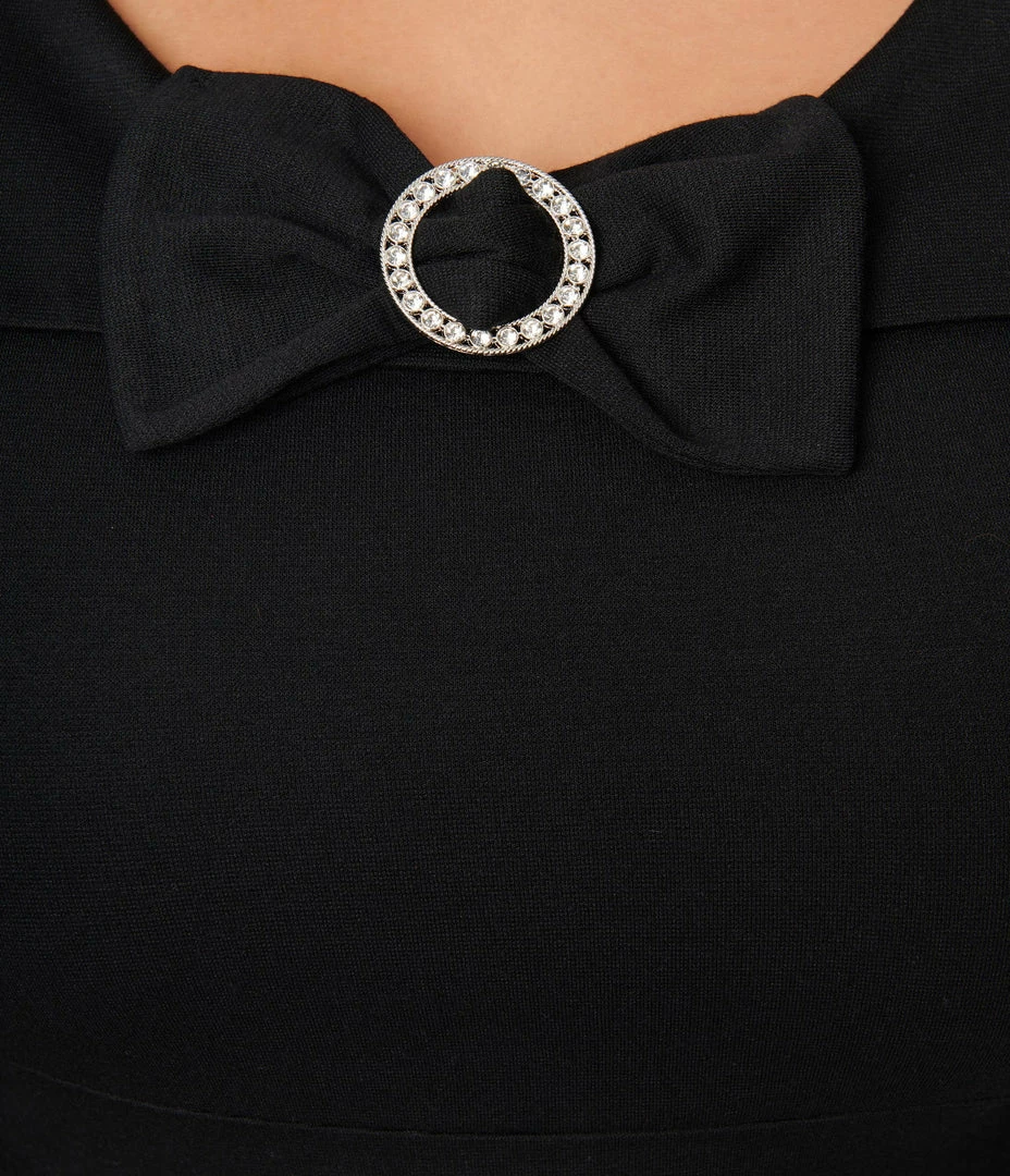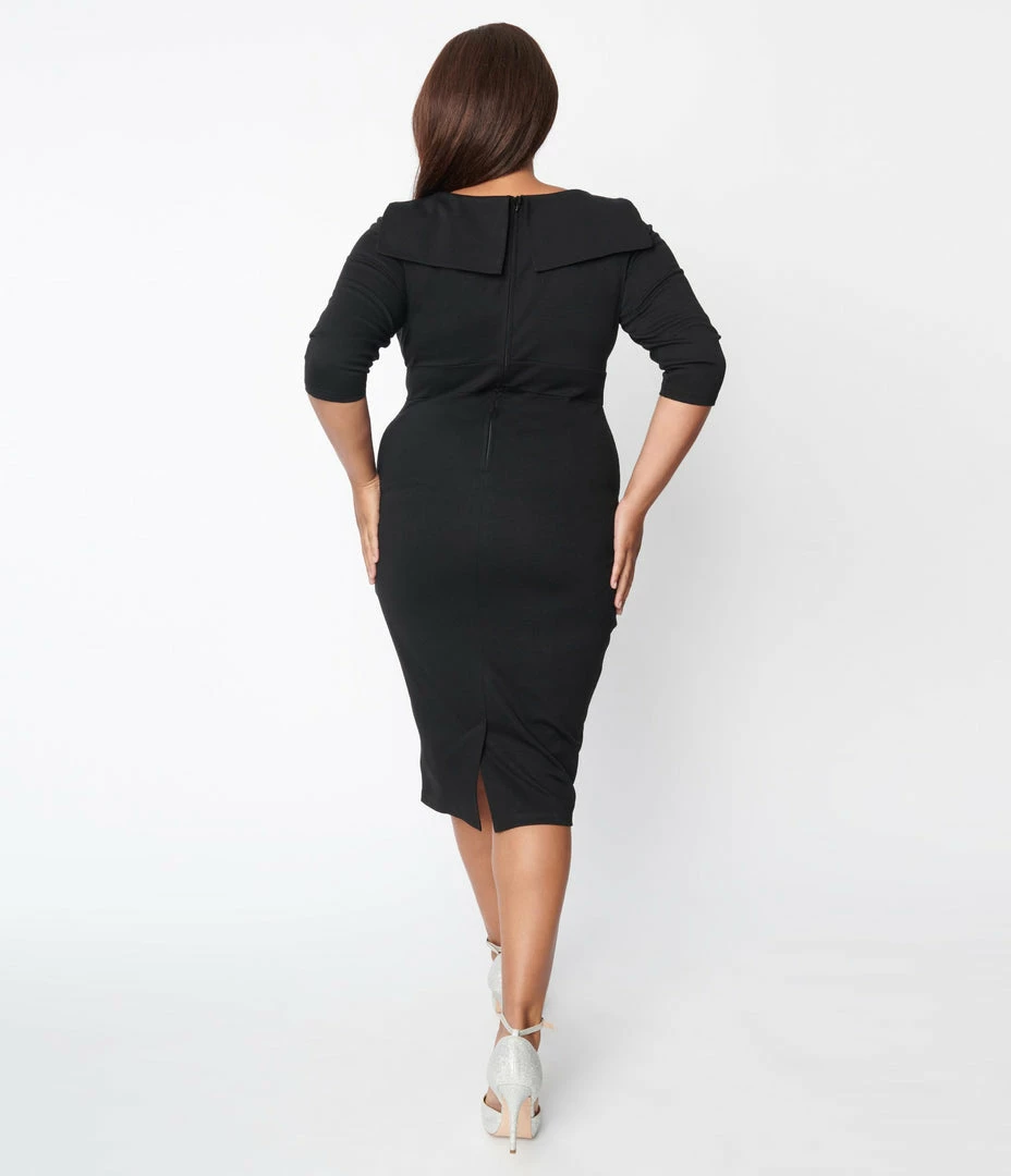 This dazzling plus size dress is crafted in a marvelous black stretch knit fabric. Boasting a bib collar accented by a charming bow, the darted bodice is framed by three-quarter length sleeves, while the pencil skirt hugs your curves. Complete with attached fabric belt, and back zipper.