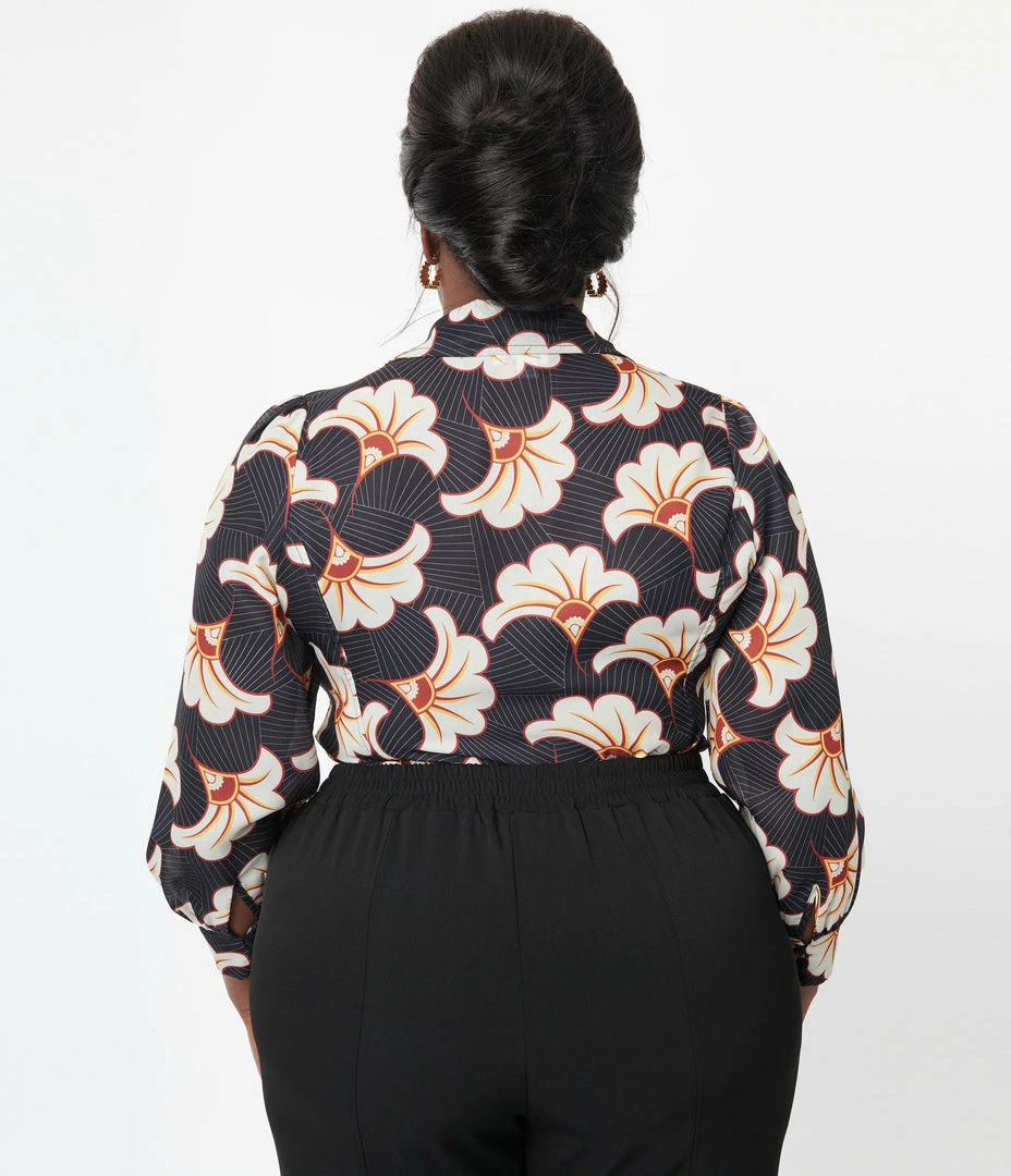 Flash Sale 🌟 Trending Unique Vintage Plus Size Black & Ivory Deco Floral Print Bodysuit ❤️