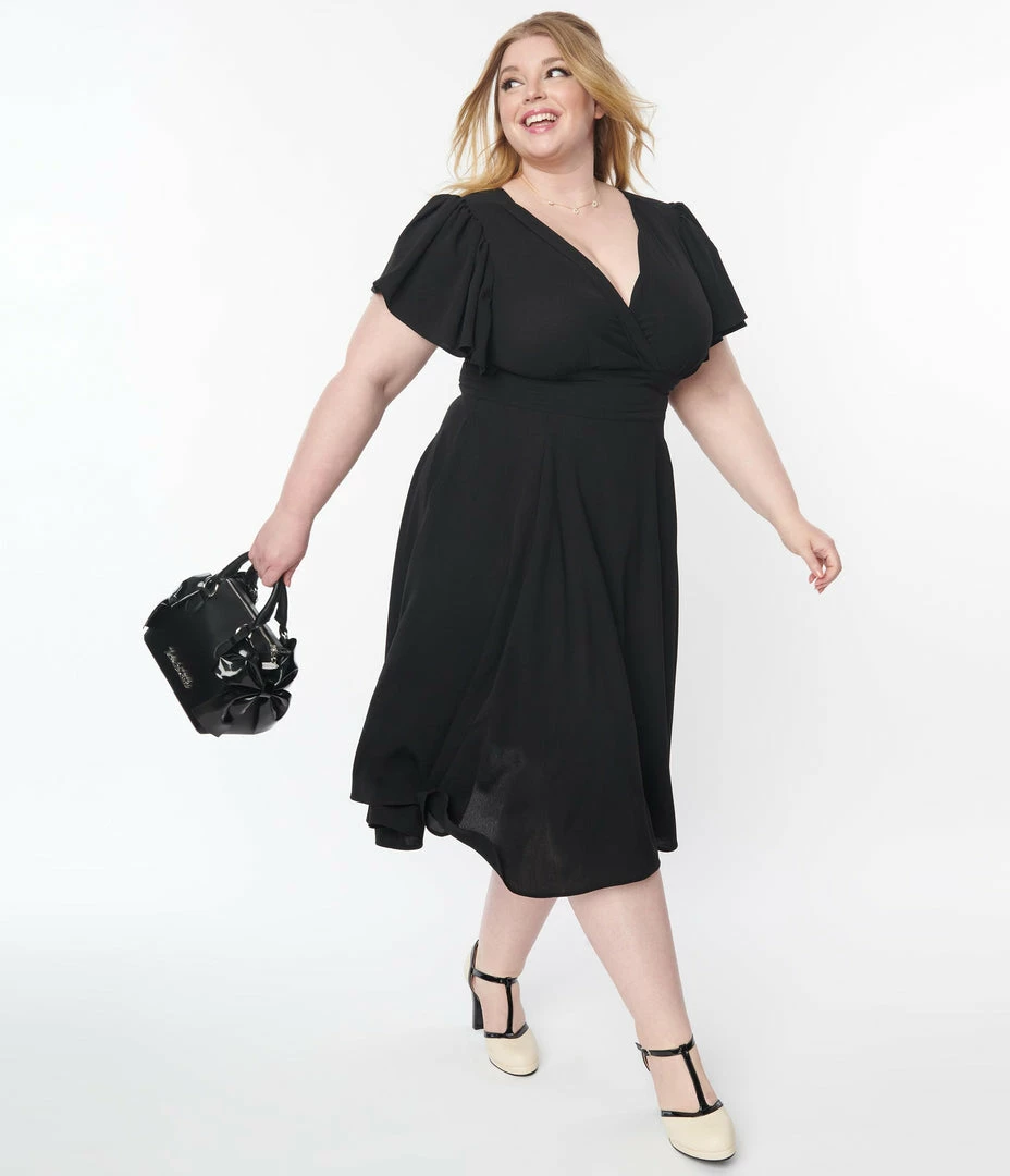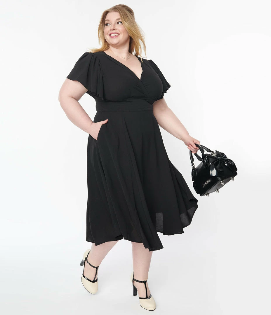 This sweet plus size swing dress is crafted in a lightweight, solid black textured crepe. Outfitted with fluttering short butterfly sleeves, a self tie back bow, a back zipper, and side pockets.