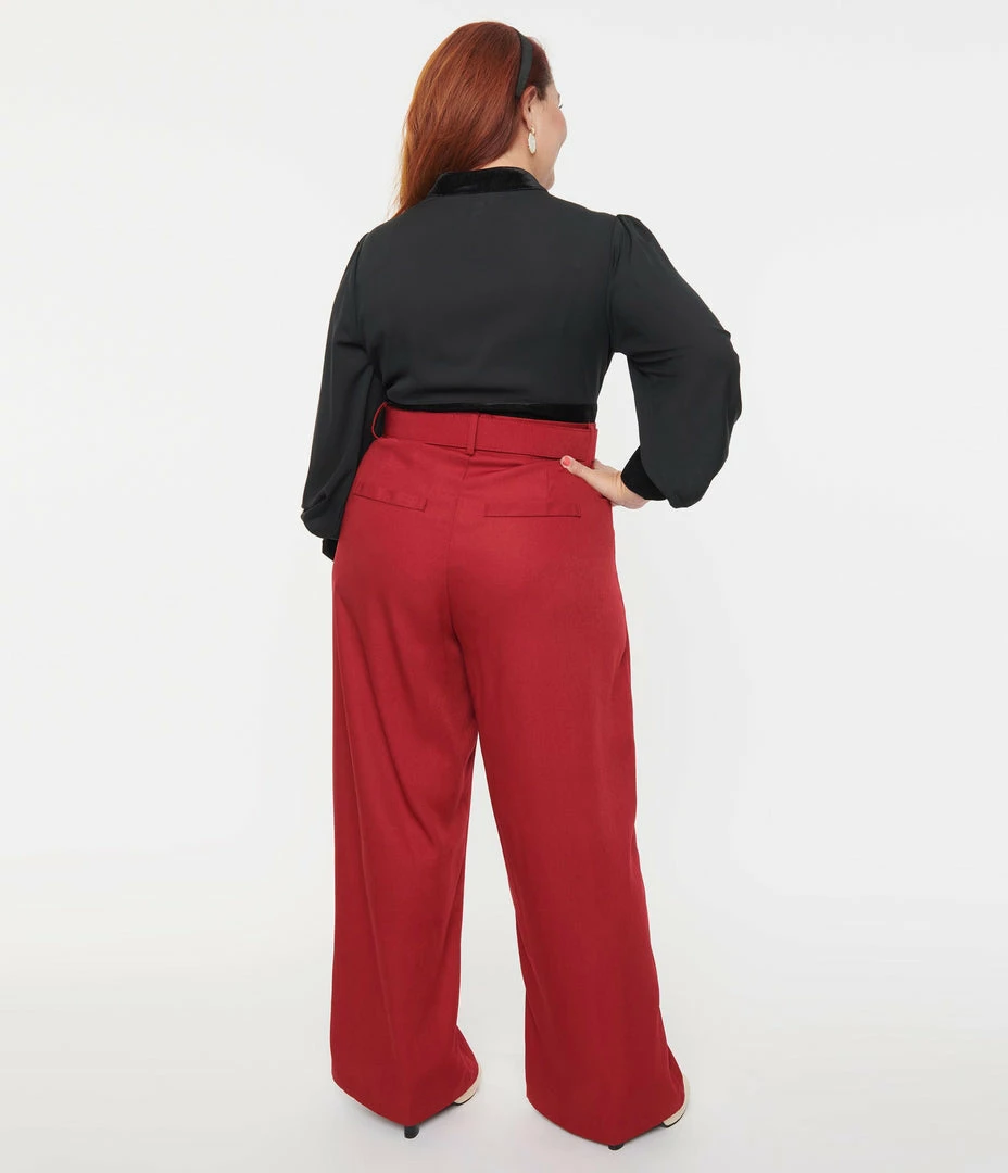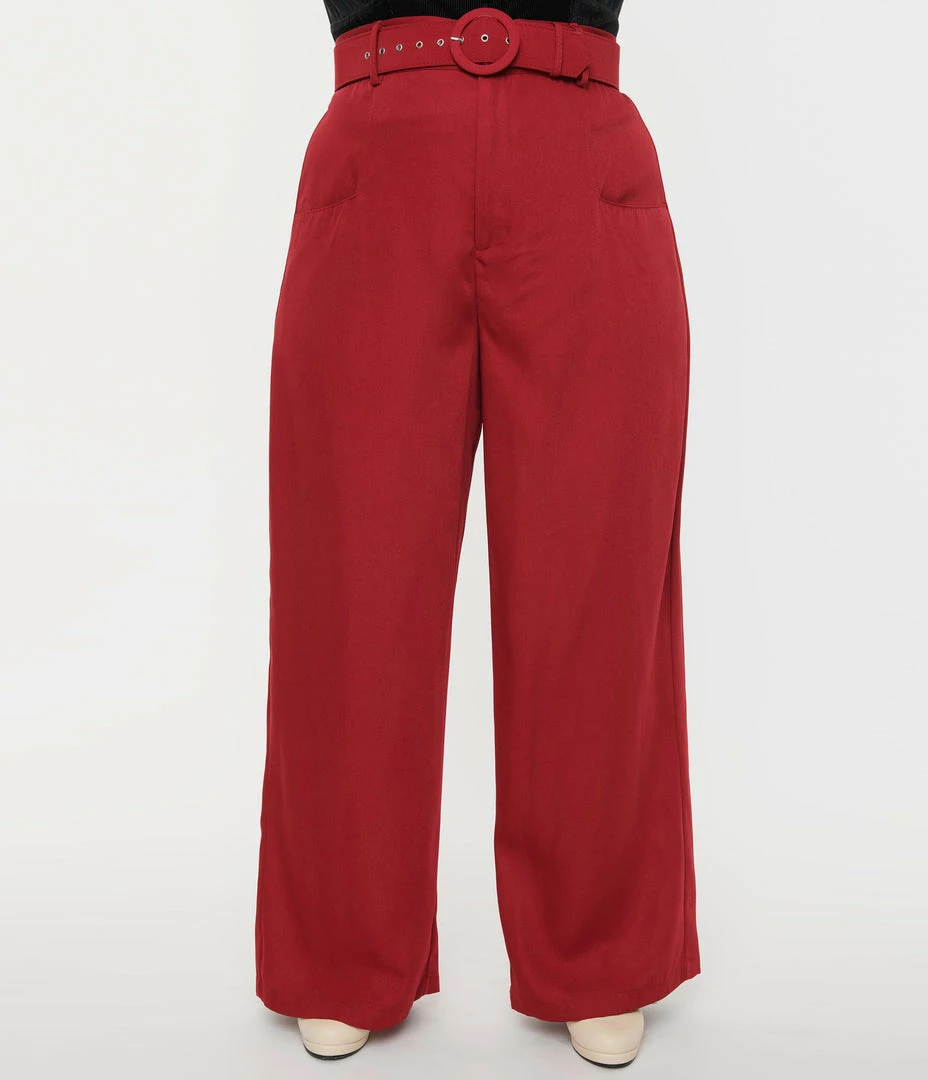 The plus size Ginger Pants are crafted in a lightweight woven and set in solid burgundy red. The high waisted silhouette is accented with wide legs to create a retro silhouette that flatters. Complete with front zipper, side pockets, and matching belt.