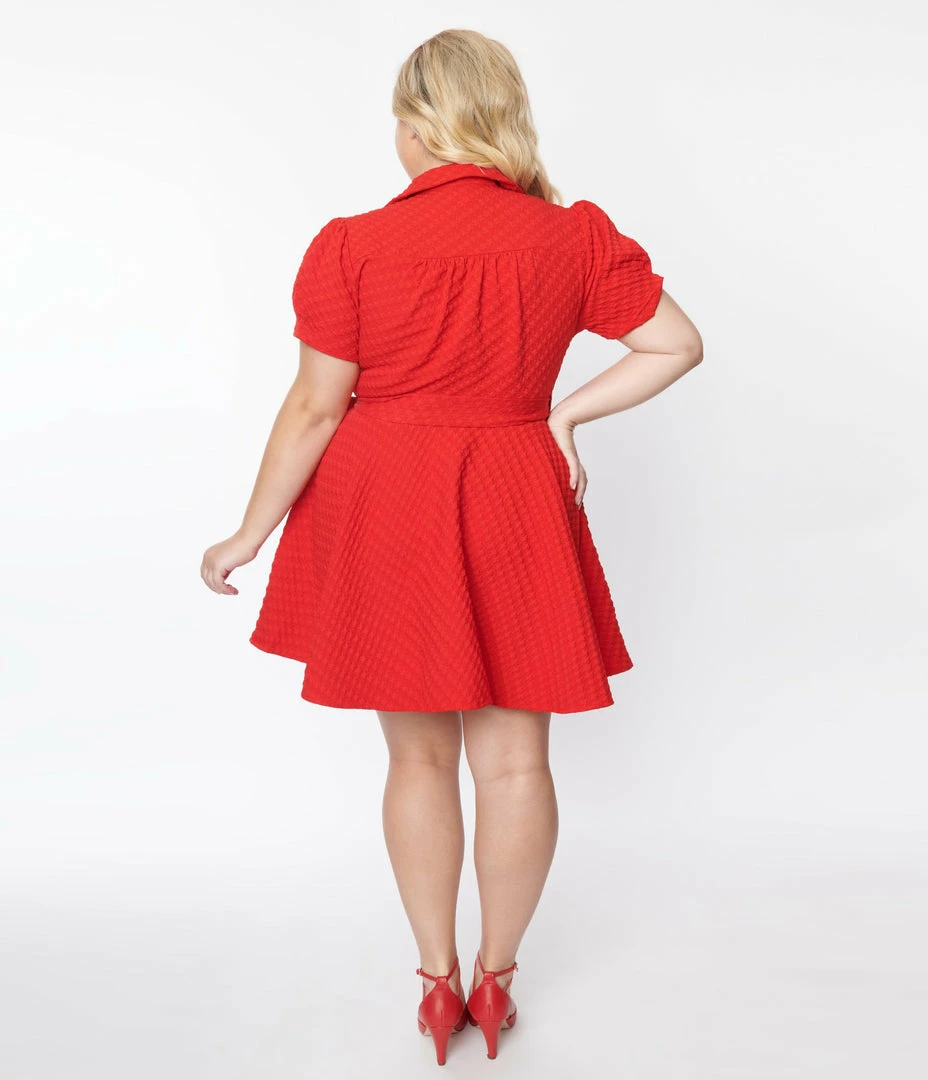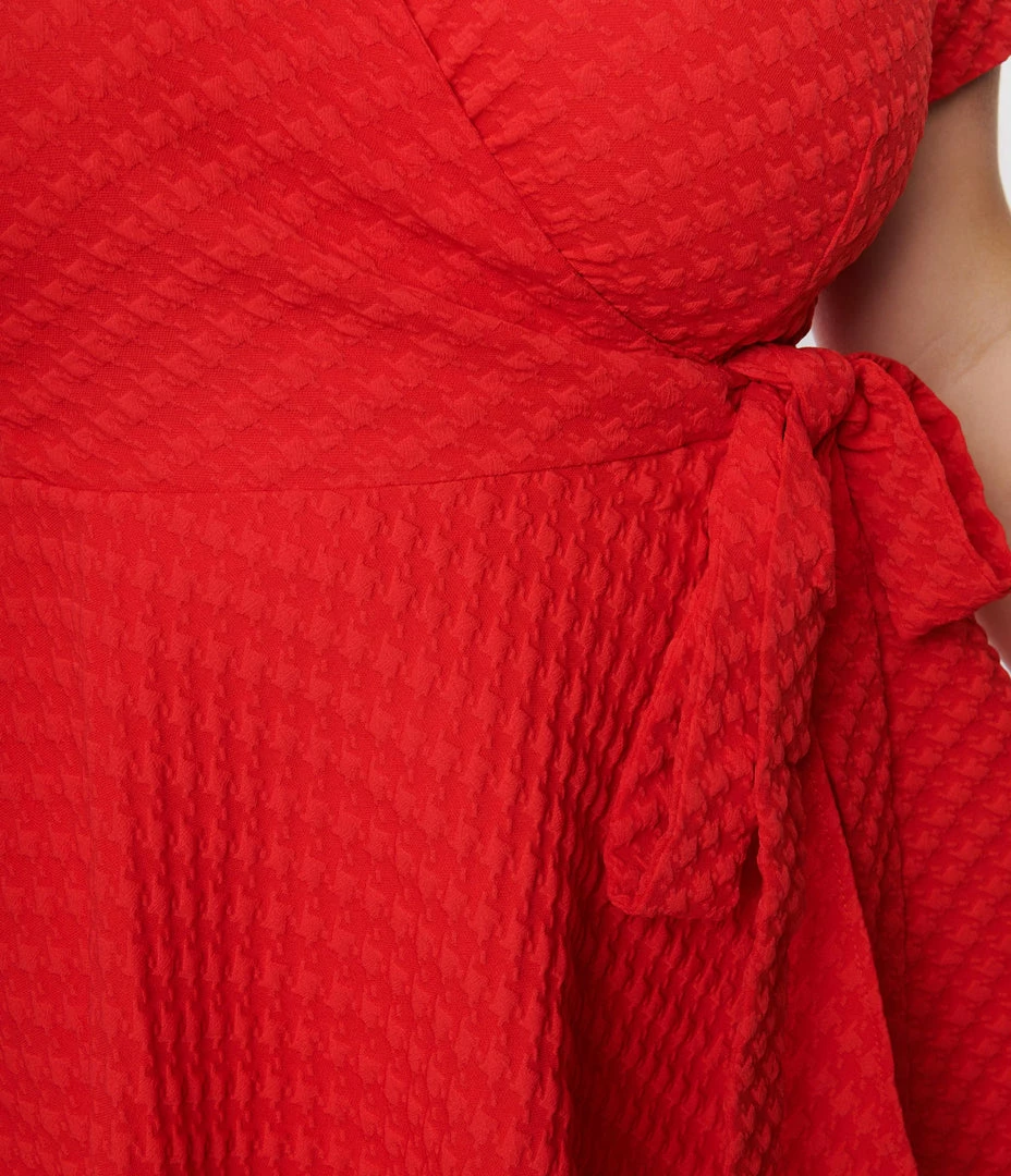 This darling plus size wrap dress is crafted in a bright red woven fabric that dances with a textured houndstooth design throughout. The classic notched lapel cross over bodice is met with short sleeves and ties securely at the waist, while the flare skirt drops playfully above the knees in delightful perfection.