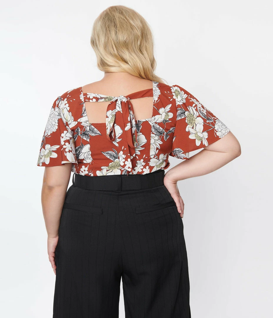 Budget 🌟 Trending Unique Vintage Plus Size Rust Red & White Floral Flutter Sleeve Blouse ✨