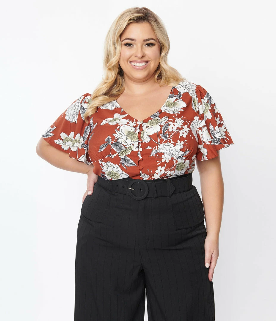 Be the first to review “Budget 🌟 Trending Unique Vintage Plus Size Rust Red & White Floral Flutter Sleeve Blouse ✨” Cancel reply