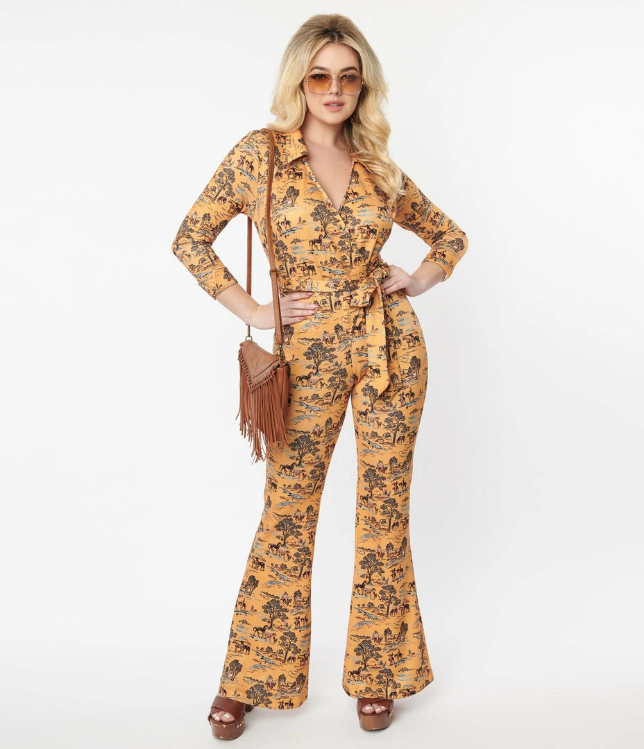 This jumpsuit is cast in a gorgeous knit fabric boasting a sweet toile scene print of cowboys and horses throughout the mustard yellow backdrop. Boasting a sassy self tie wrap bodice that leads to a classic collar, while the dramatic flare legs drop from the seamed waist and dance at your feet!