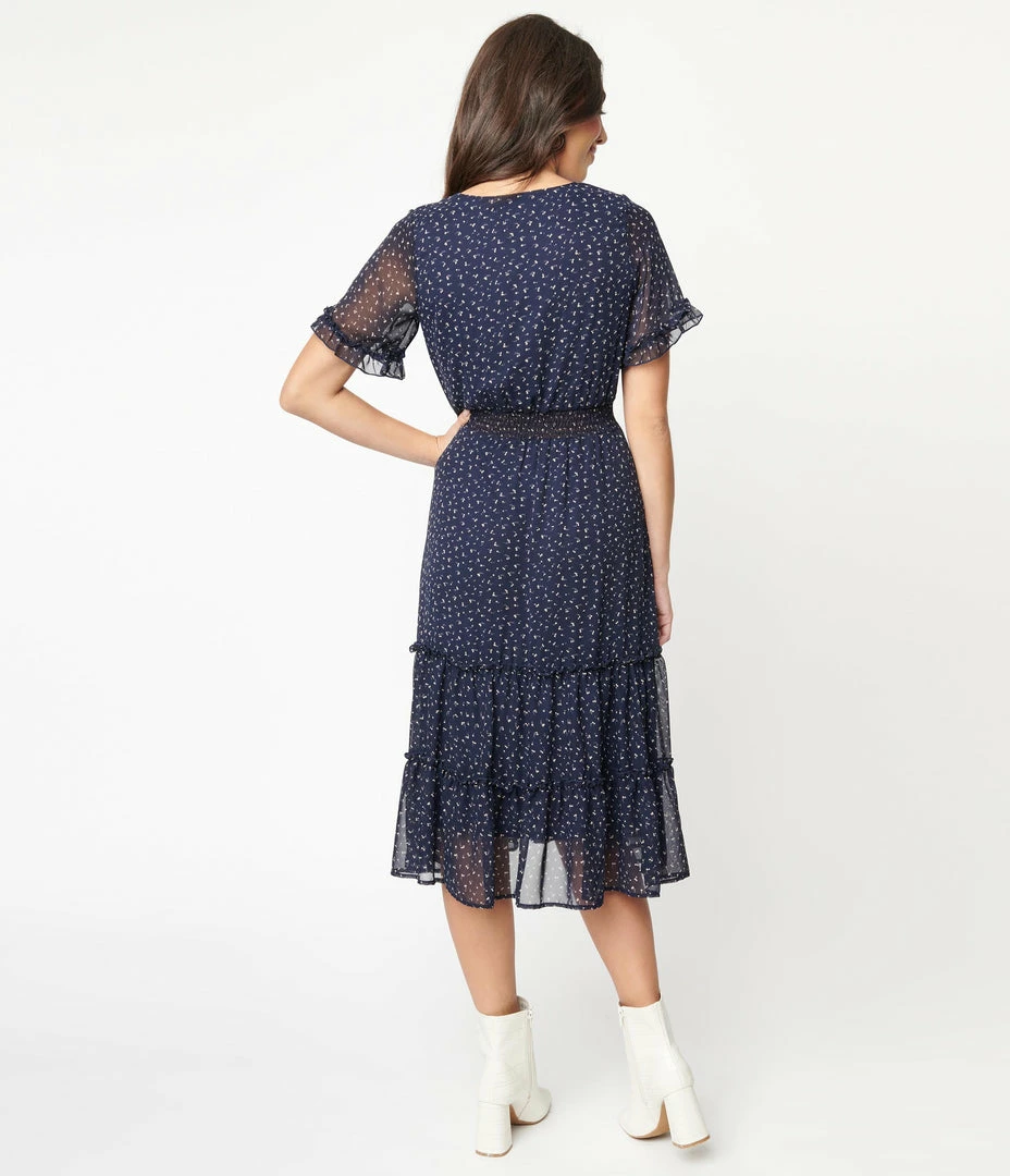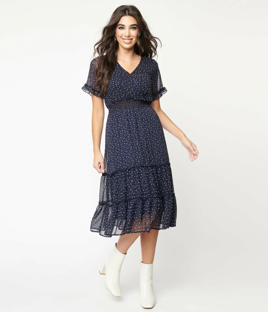Playful frolics await, dolls! A fabulous vintage style dress, this beautiful silhouette is crafted in semi-sheer navy blue chiffon that dances with cream abstract spots throughout. The surplice neckline is framed by short sleeves with sweet ruffle cuffs. The waist is cinched in by the smocked waisted band, while the gathered tier midi skirts drops below your knees. Complete with lining for all day comfort!