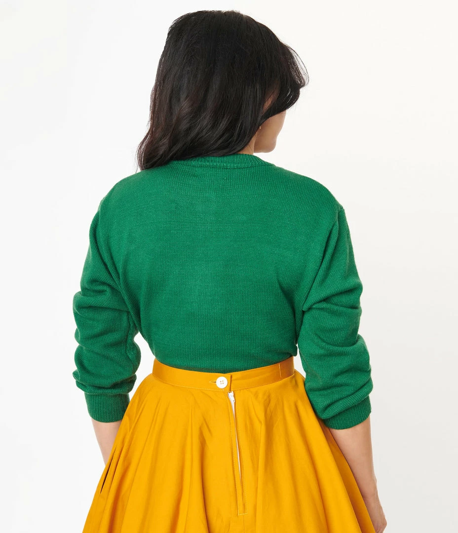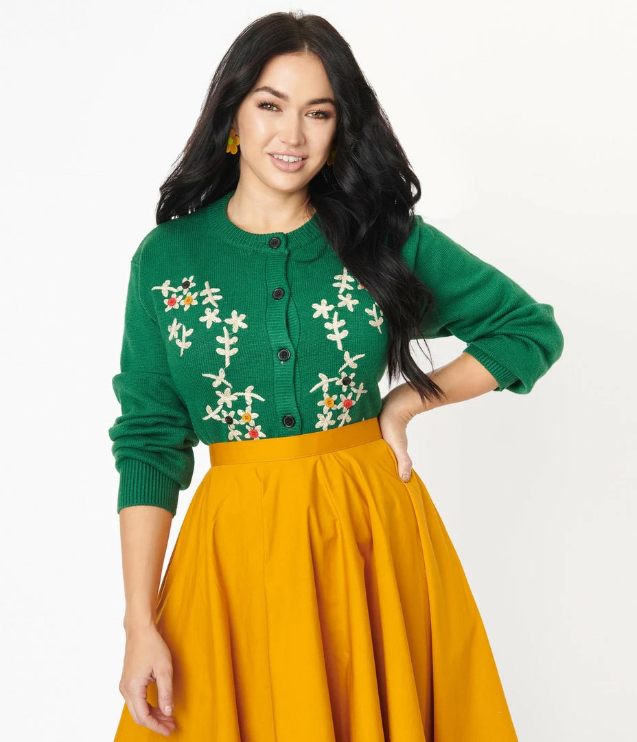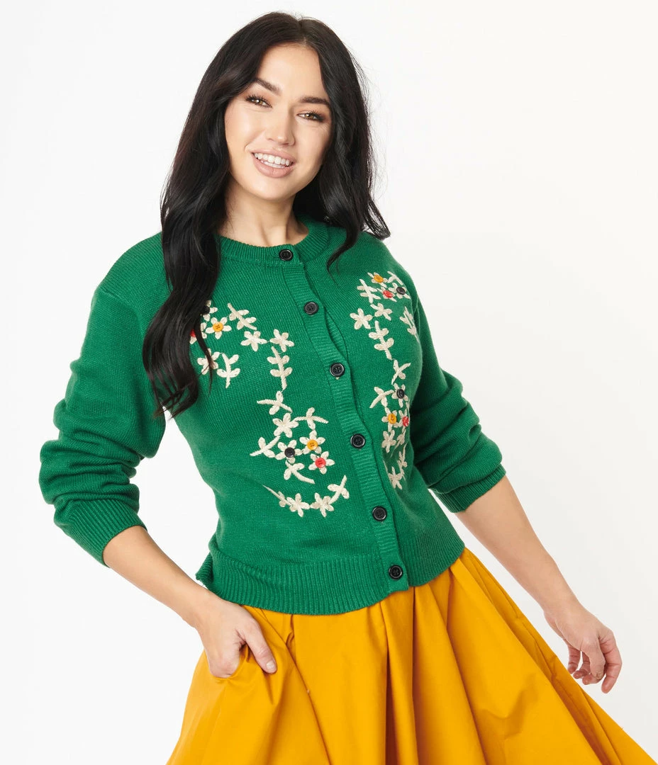A vintage mix of cozy and charm, darling! This sweet separate is crafted in a green knit with taupe florals accented with colorful buttons centering the button up design. A classic scoop neck, long sleeves and ribbing at collar, cuffs and hem combine to create an effortlessly classic piece!