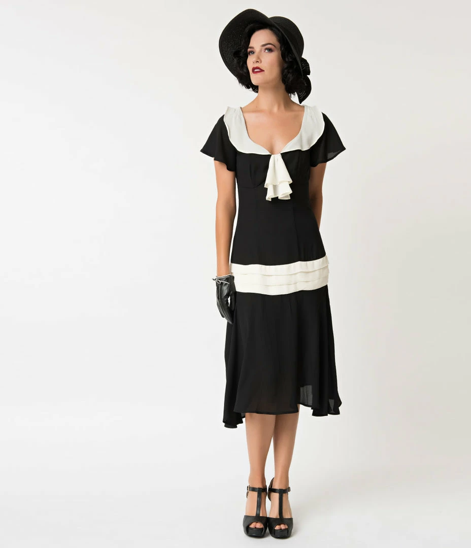 We found a reason to smile, dears! Glamorous and graceful, The Wilshire is a striking 1920s style day dress crafted in a lovely black woven blend with stunning ivory cream details. Simplistic short sleeves flutter around the bodice as it makes way for a wide V-neck with lovely ivory flounce and draped faux collar tie. The pointed empire waist tops a courtly seamed and paneled center that descends to a graceful banded drop waist, styled in ivory with horizontal pleats. With an airy asymmetrical hemline, back zipper and hook, the Wilshire is a slice of retro radiance you can’t pass up!