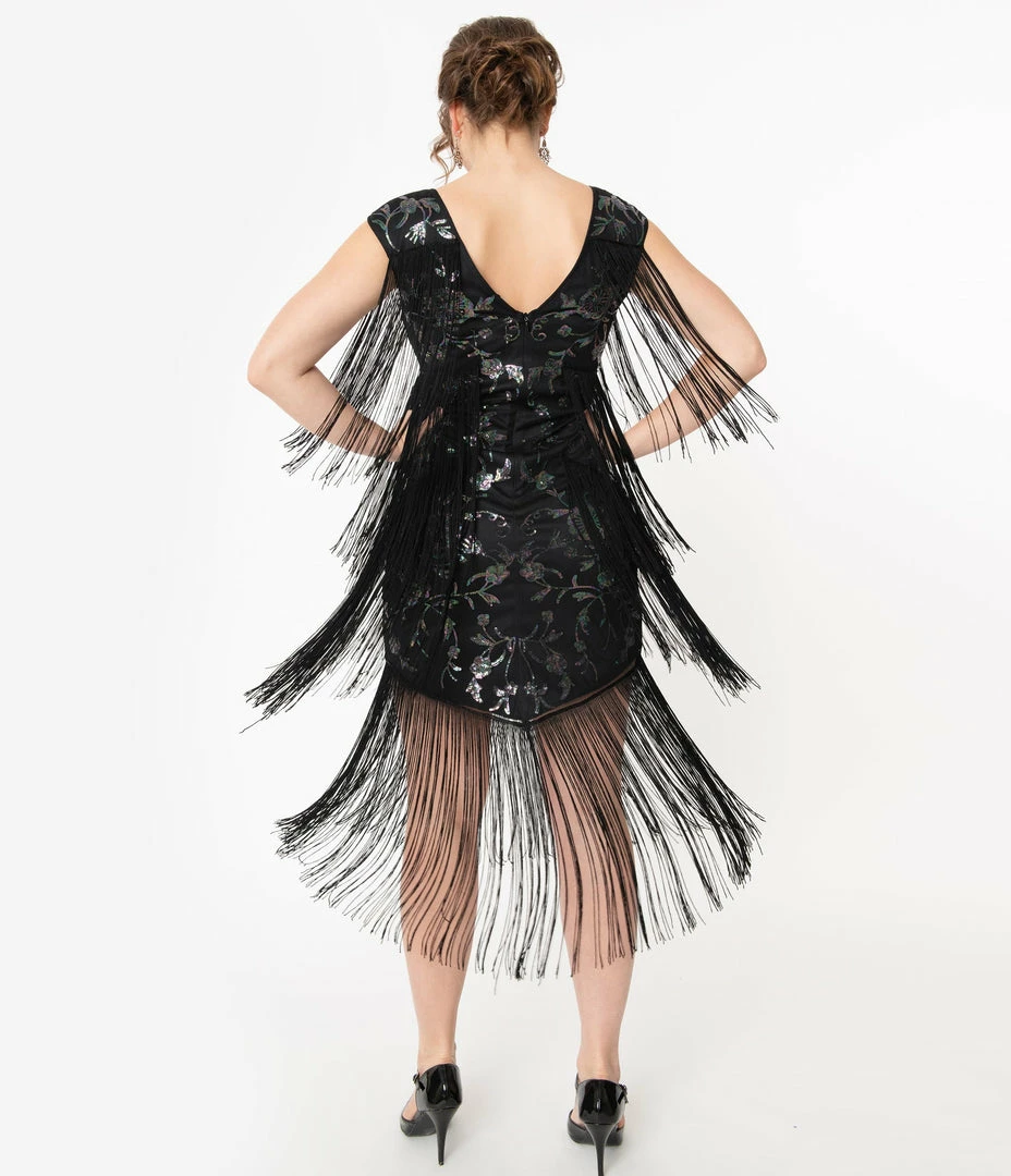 It all starts here, darling! A sweet flapper frock for your next Gatsby event, the Bayonne Dress from Unique Vintage features a dazzling array of 1920s accents throughout the black silhouette. Twinkling iridescent sequins provide a fabulous floral motif as the high bateau neckline is framed by charming cap sleeves while tiered black fringe cascades from the shoulders, bust, hips, and asymmetrical hemline. Fully lined and secured with a back zipper, itโs your show to steal!