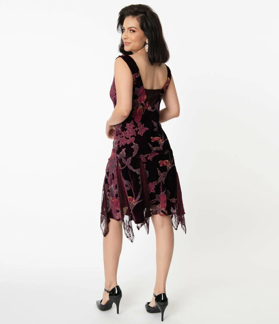 Flash Sale ๐งจ Unique Vintage 1920s Burgundy Velvet Floral Hemingway Flapper ๐ Dress ๐
