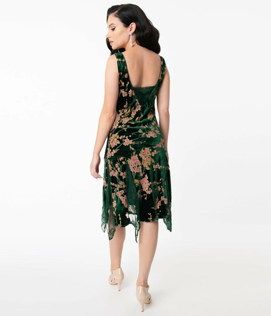 Outlet ✨ Unique Vintage 1920s Emerald Velvet Floral Burnout Hemingway Flapper 👗 Dress Clothing 🌟