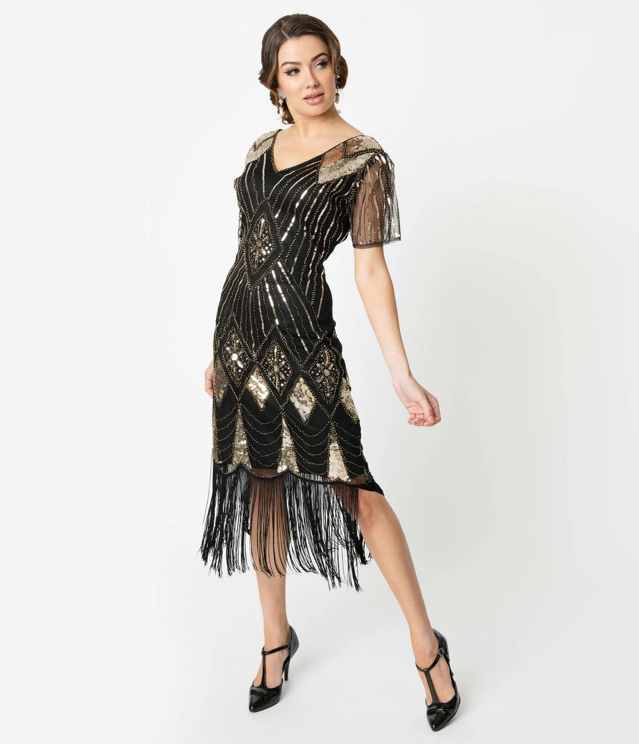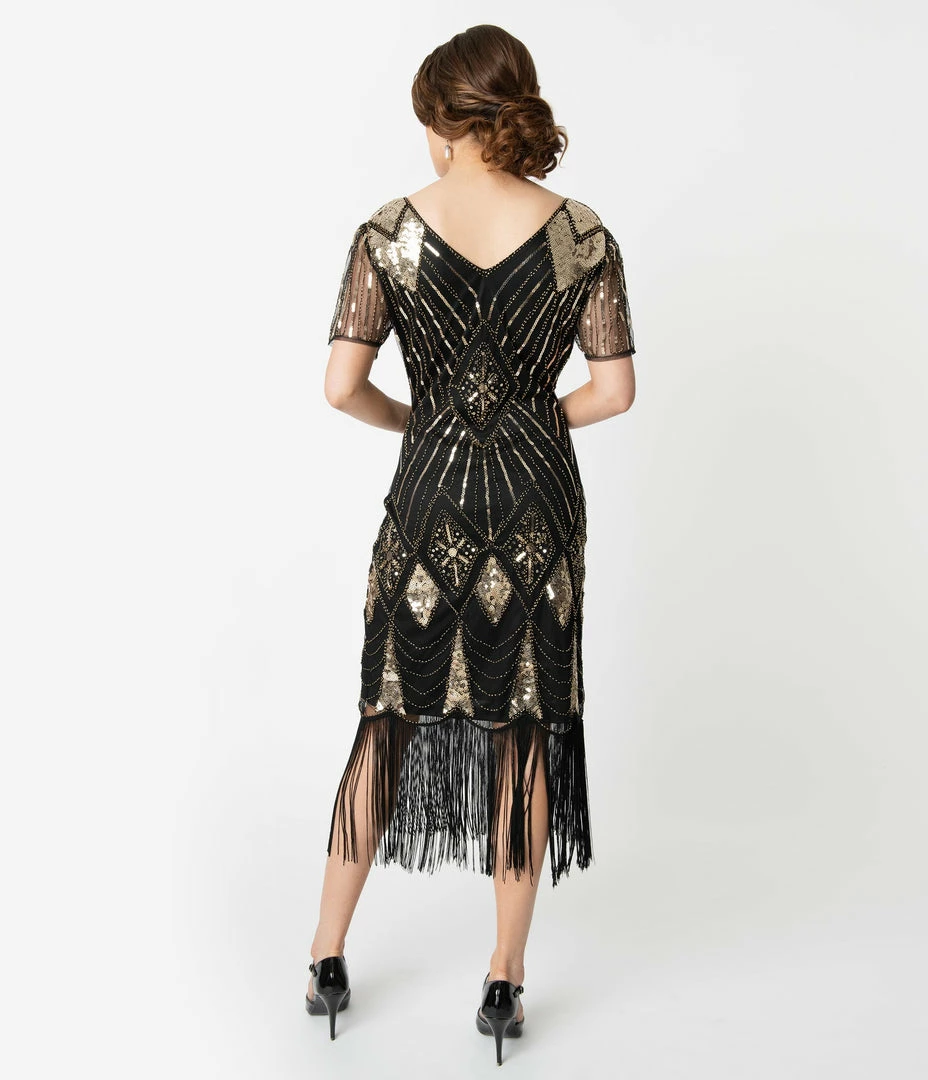 It’s just a shot of gin away, ladies! This stunning silhouette from Unique Vintage features a brilliant array of gold sequins and beading in a fabulous sunburst and chevron pattern throughout. The Katriane Flapper boasts a sultry V-neckline and sweet short sleeves in a delicate black mesh while the tapered waist flatters your figure. The scalloped hemline features long black fringe that dances past your knees. Complete with a side zipper, don’t forget the olive!