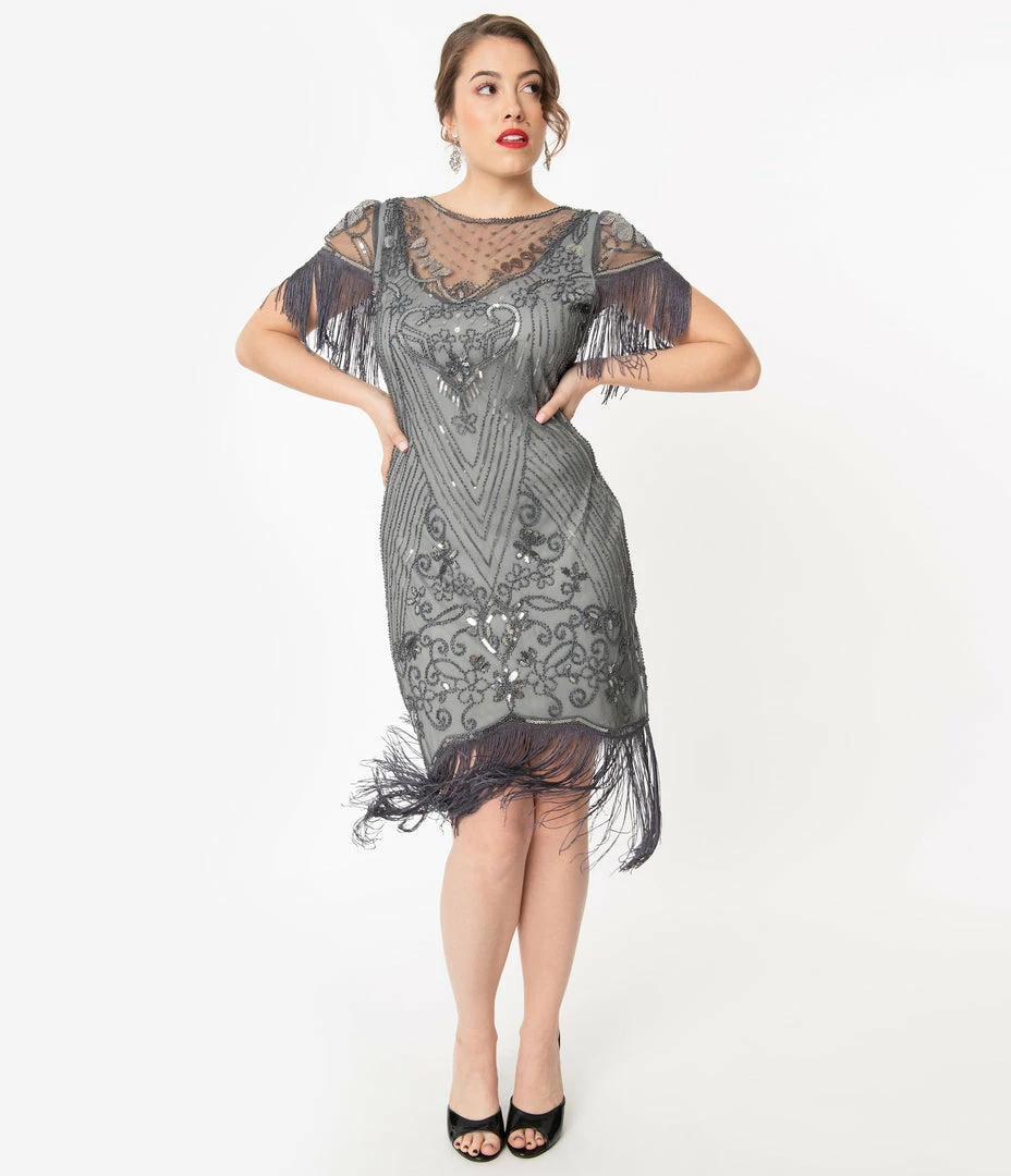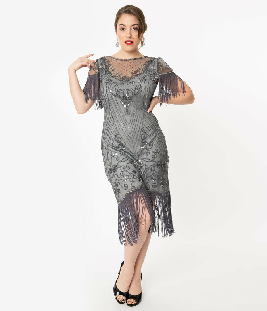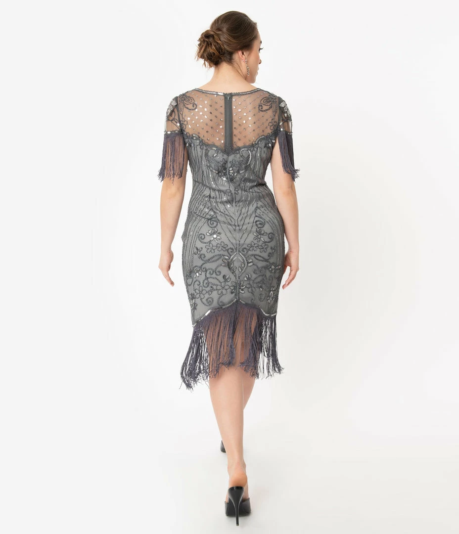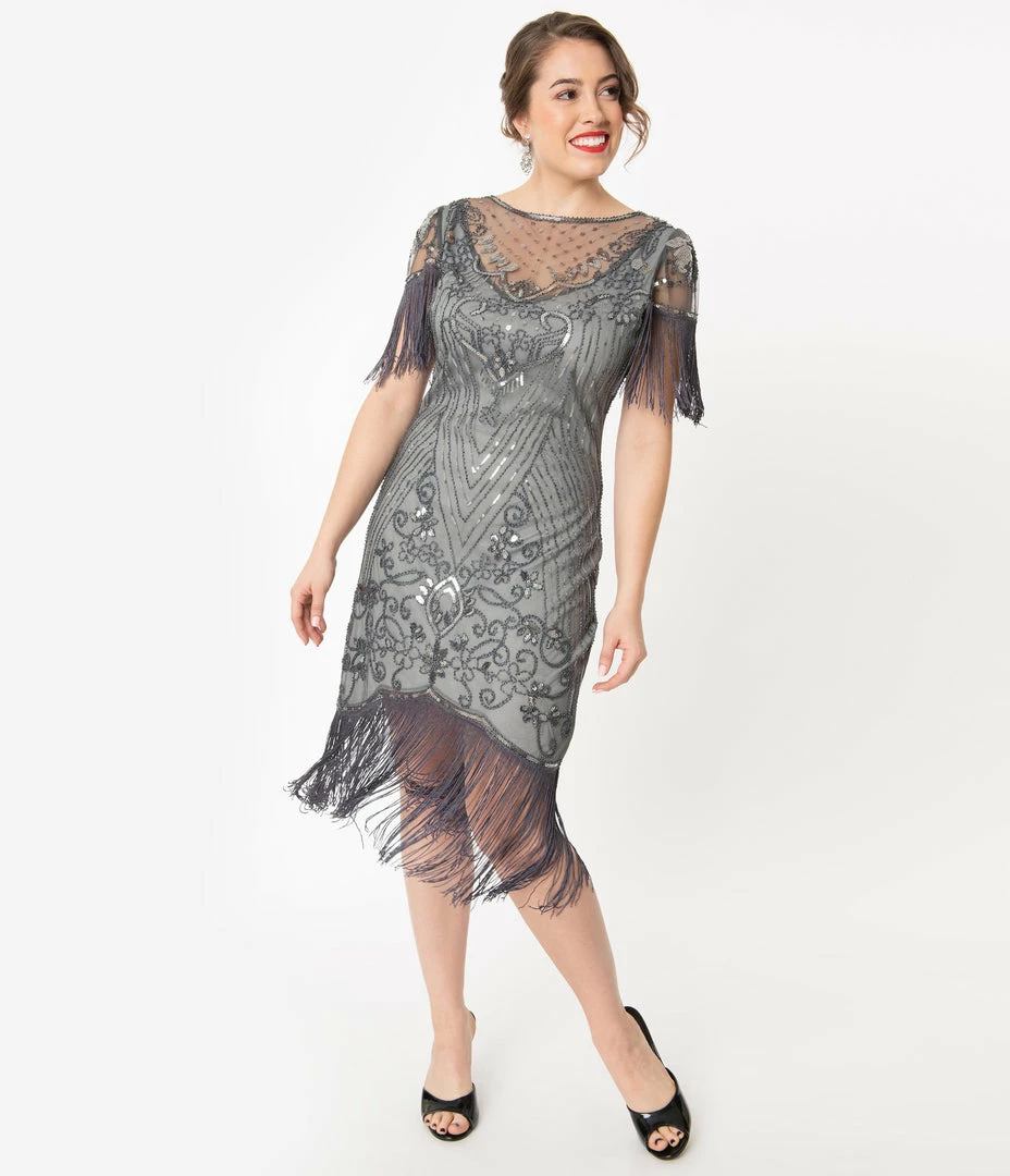 A flapper girl can’t live without her fringe, dames! Twinkling and breathtaking, this stunning flapper dress from Unique Vintage features a dazzling array of silver beads and sequins throughout a dramatic 1920s silhouette. The Nadine Flapper is crafted with a grey mesh overlay that creates a delightful illusion neckline over a v-neck knit lining and adorable cap sleeves dance with long fringe to frame your feminine features. The tapered waist forms to your figure and drops to a gentle scalloped hemline that sways with long fringe. Outfitted with a back zipper, we’re ready for your next creative act!