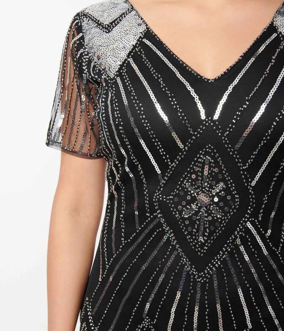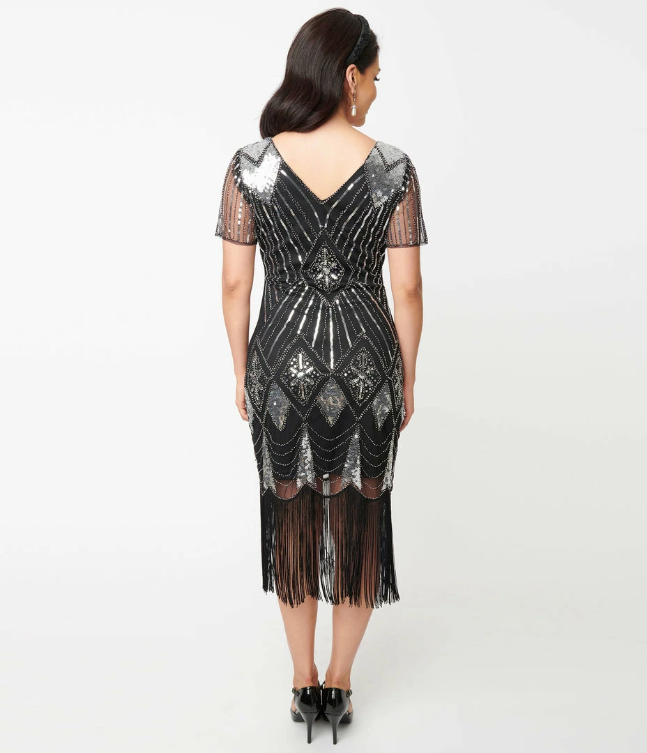 Itโs just a shot of gin away, ladies! This stunning silhouette from Unique Vintage features a brilliant array of silver sequins and beading in a fabulous sunburst and chevron pattern throughout. The Katriane Flapper boasts a sultry V-neckline and sweet short sleeves in a delicate black mesh while the tapered waist flatters your figure. The scalloped hemline features long black fringe that dances past your knees. Complete with a side zipper, donโt forget the olive!