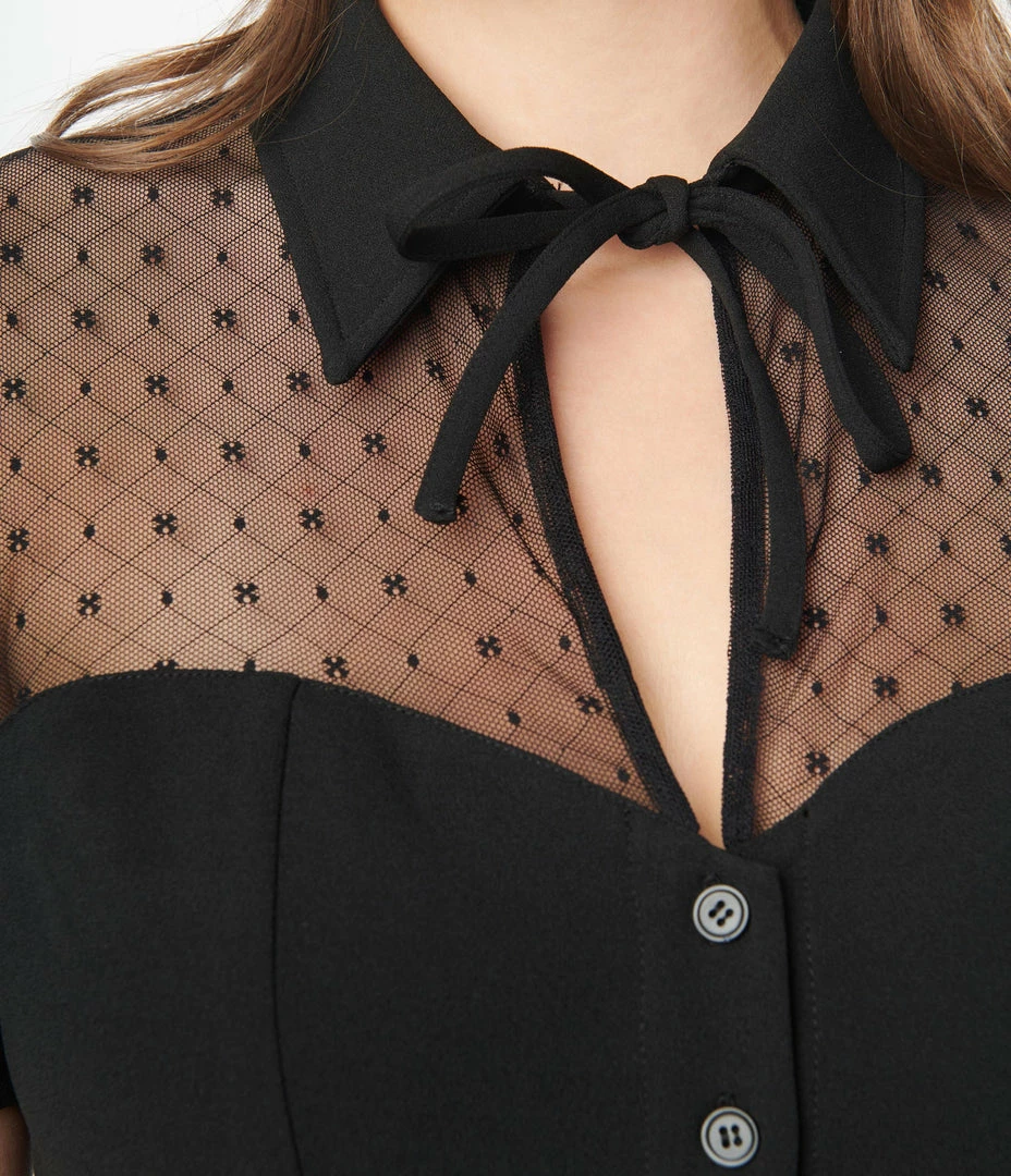 A sweet piece for your vintage wardrobe, this blouse is crafted in a marvelous black stretch blend for a flattering fit. The sheer mesh yoke features a checkered pattern while the button up front nips in the sweetheart bodice while a self tie keyhole centers the classic collar. Complete with princess seams, sheer short sleeves, and a tapered waist for a complimentary silhouette!