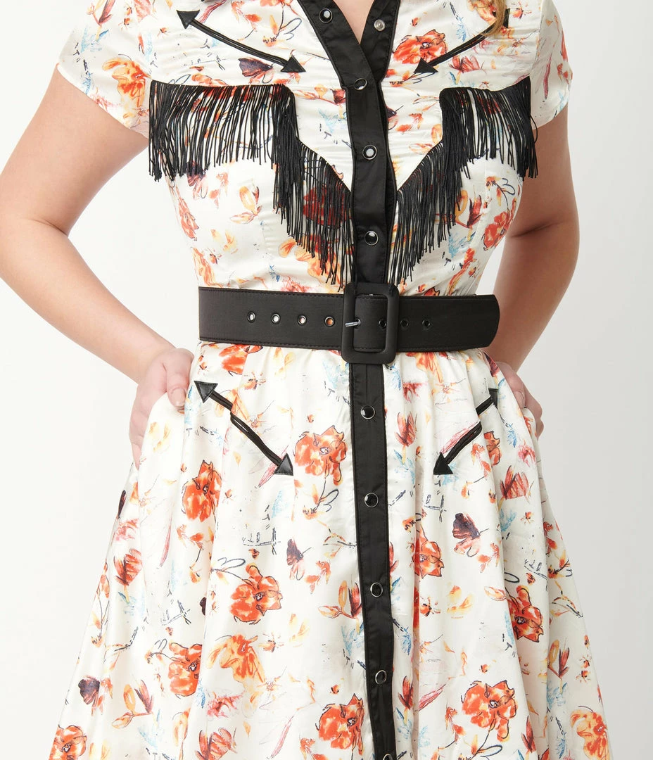 This gorgeous western inspired swing dress is crafted in a lightweight satin-like fabric that radiates with a delightful multicolor floral print cascading throughout a cream backdrop. Outfitted with a snap button up front, black fringe, faux pocket appliquรฉs, and a belt. Complete with side pockets and faux pocket appliquรฉs on the front.