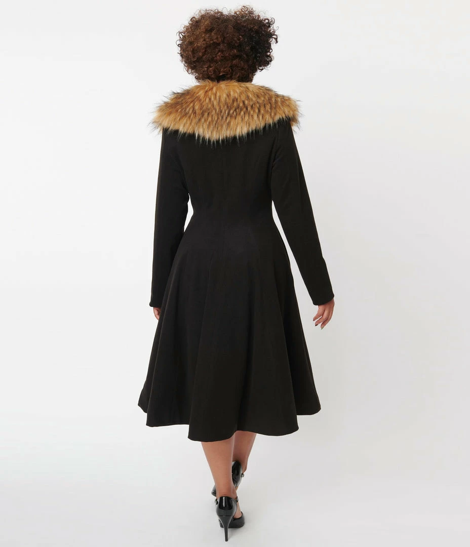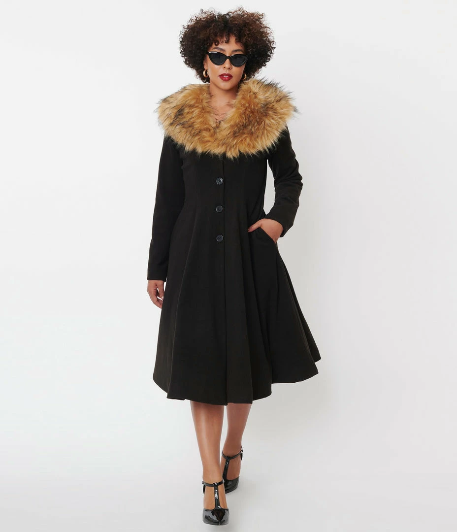 Get ready to flaunt, darling! This stunning swing coat from Unique Vintage is a fabulous vintage inspired piece to keep you stylish as the temperature drops. The Carrie Coat is crafted in a marvelous woven fabric in a brilliant black, topped by a wide brown faux fur collar that can be easily removed for versatile style. The button up front creates a striking silhouette while the long sleeves and lining keep you comfortable. The sweeping swing skirt drops past the knees and is outfitted with side pockets to stow away your mittens!