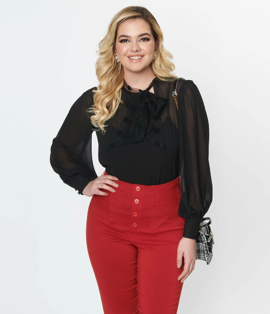This elegant blouse is crafted in a lightweight chiffon and set in solid black that features clip dots throughout. Outfitted with a self tie neck bow with flocked polka dots, long sleeves, and button cuffs.