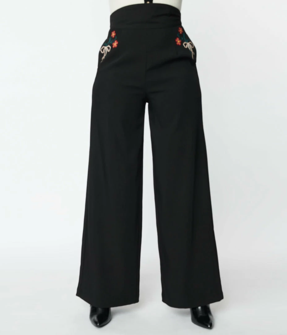 Hot Sale ๐ Unique Vintage Black & Floral Embroidery High Waist Pants โ๏ธ
