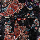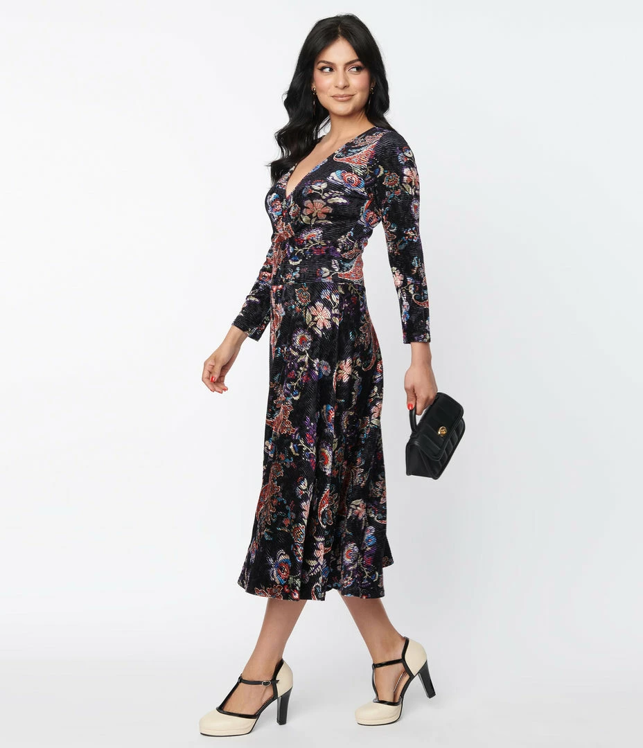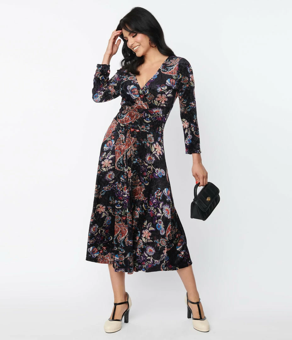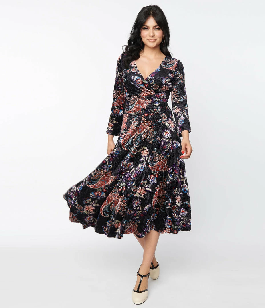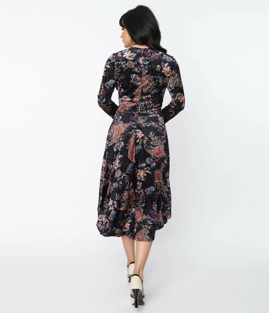 A ravishing velvet swing dress, cast in black and dancing with florals and a paisley print. Outfitted with a surplice neckline, three-quarter length sleeves that drop into a faux button cuff, and a back zipper.
