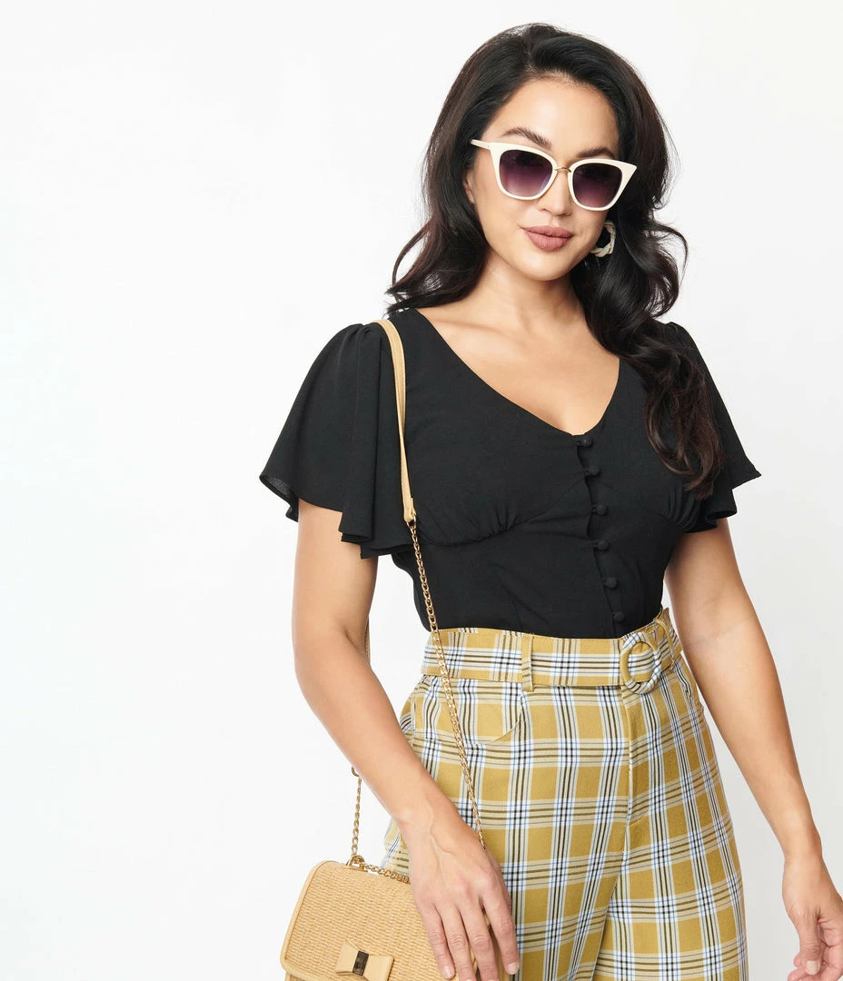 An ode to the angels, dears! A dreamy silhouette from Unique Vintage, this sweet blouse is crafted in a black textured crepe that is cinched with a button up front. The sultry V-neckline is framed by fluttering short sleeves while a sweet back tie provides a fabulous bow accent on the back!