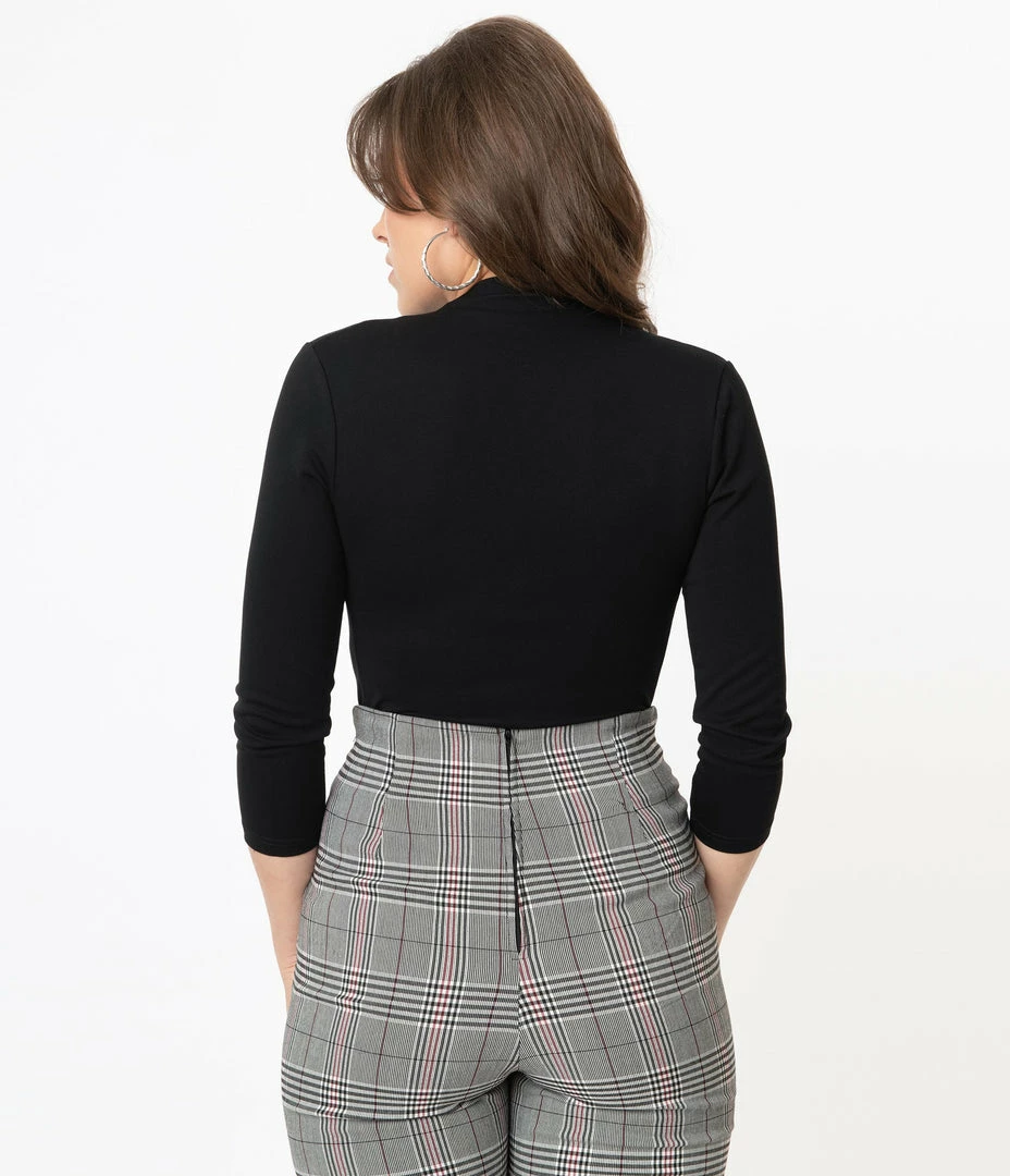 Friday is our favorite word, gals! This alluring black bodysuit from Unique Vintage is crafted in a soft and sturdy stretch knit for a comfortable fit. The Friday Night Bodysuit boasts a sultry gathered V-neckline, framed by slender three-quarter length sleeves as the dual snap button closure makes this slimming separate pair easily with your favorite skirt or skinnies!