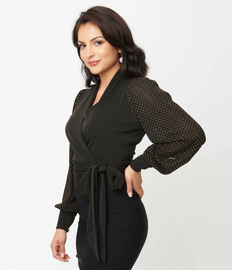 New โค๏ธ Unique Vintage Black & Gold Pin Dot Giselle Wrap Top Sale ๐