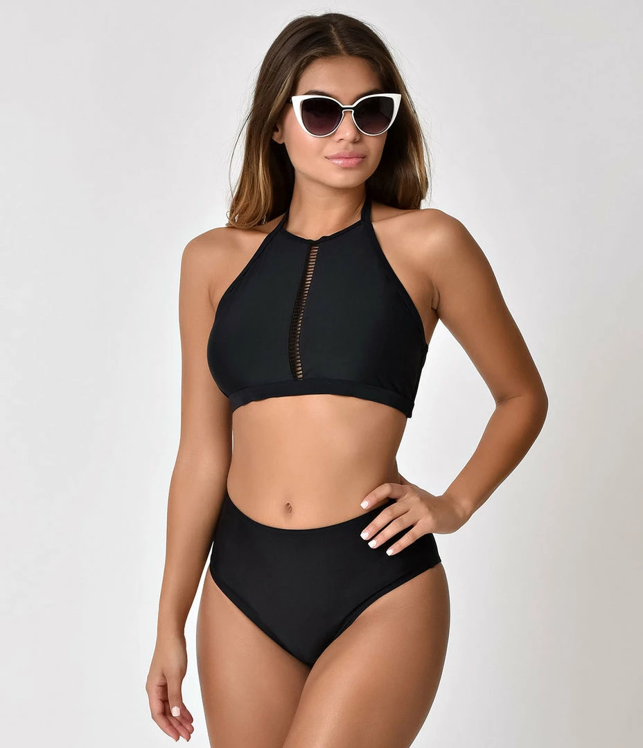 Coupon 🥰 Unique Vintage Black Halter Cordelia Swim Top Swimwear 🌟