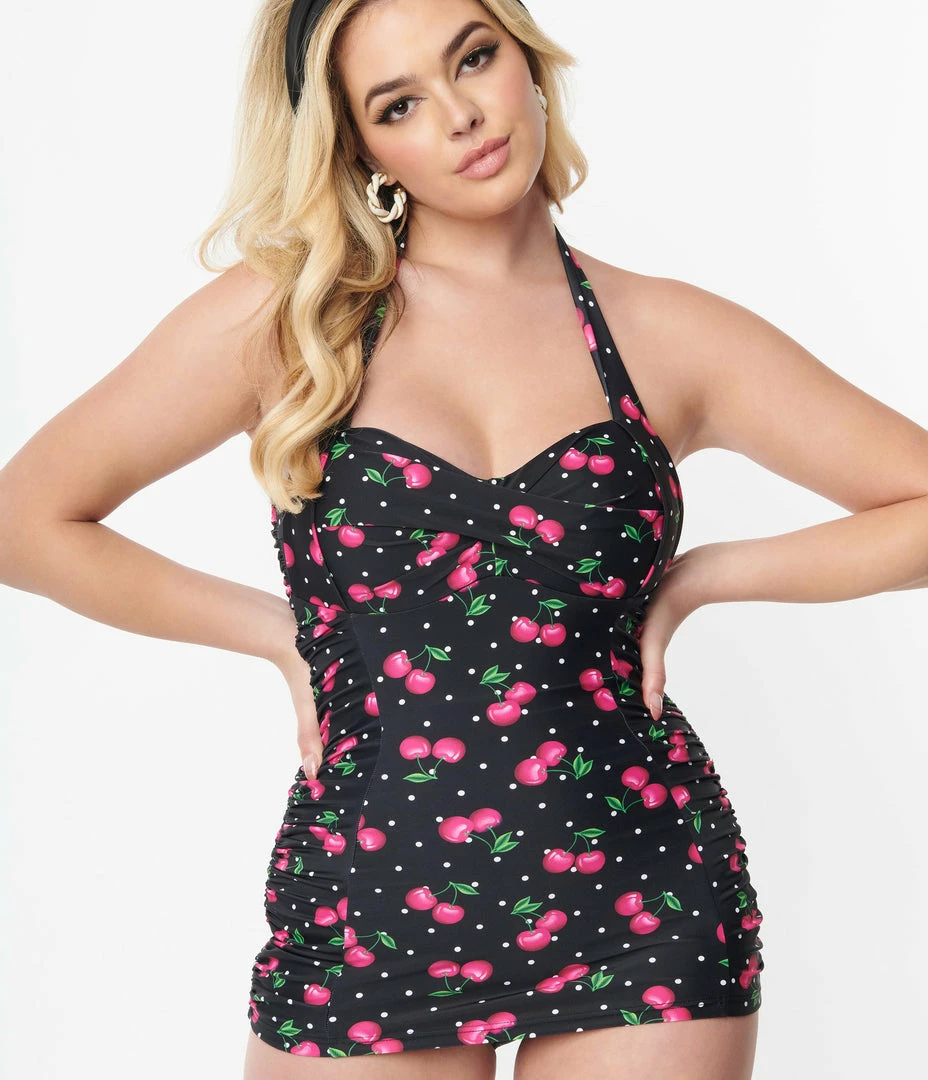 Best reviews of 😉 Unique Vintage Black & Hot Pink Cherry Pin Dot Corinne Sheath 🩱 Swimsuit 🎁