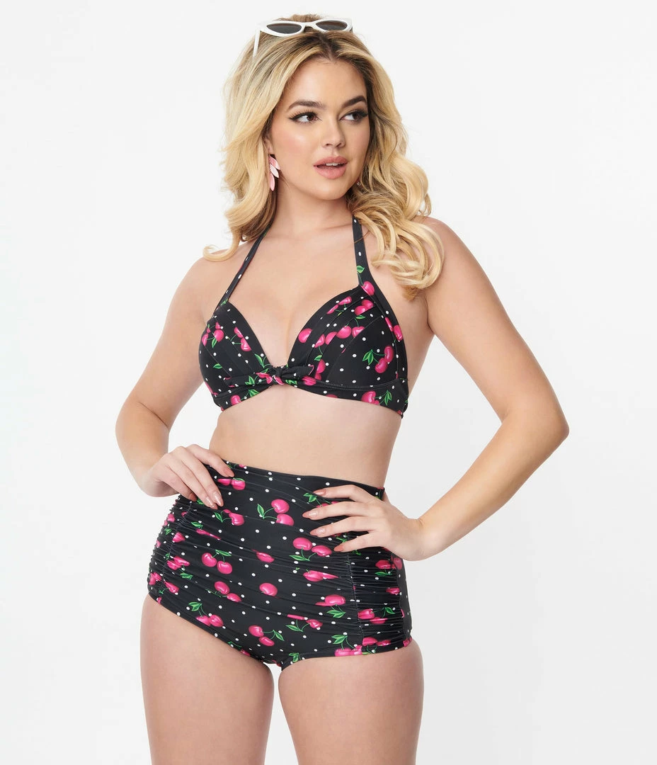 These high-waisted swim bottoms feature hot pink cherries and white pin dots through a black backdrop. Outfitted with an elastic waistband and mesh lining.