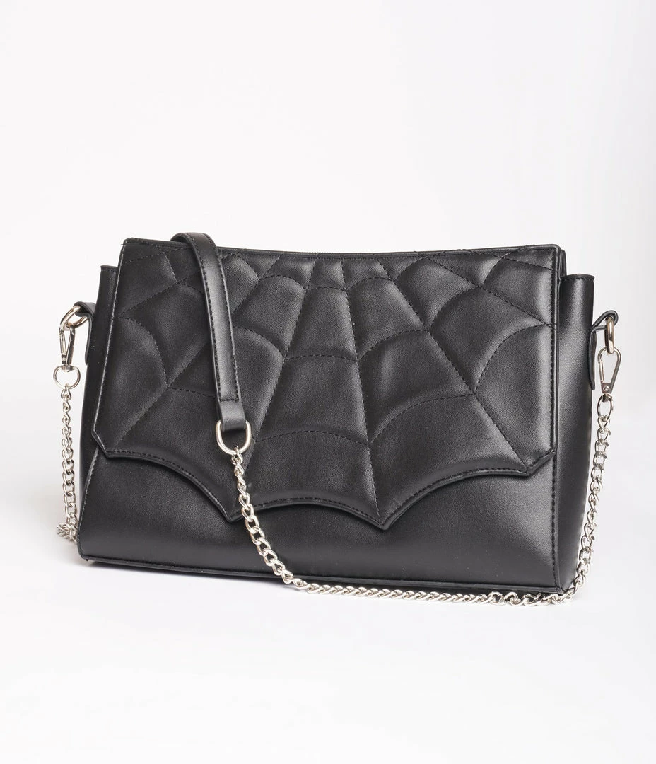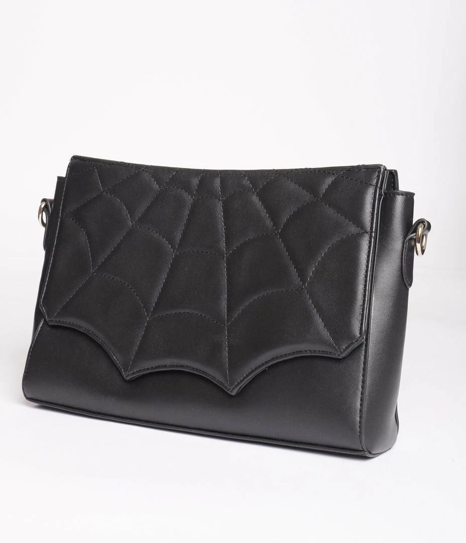This wickedly divine purse is crafted in a black leatherette and features a quilted spiderweb design over the front panel. Outfitted with an outer zipper pocket, an inner slip pockets. Complete with a removable shoulder strap.
