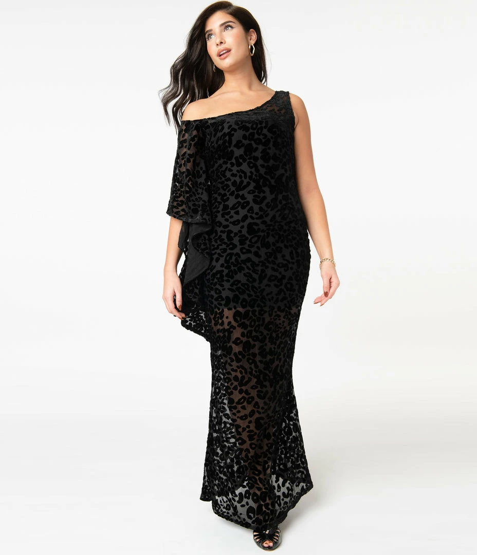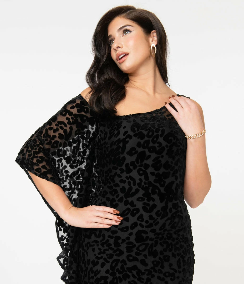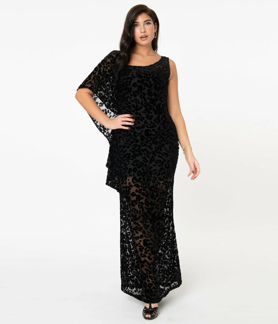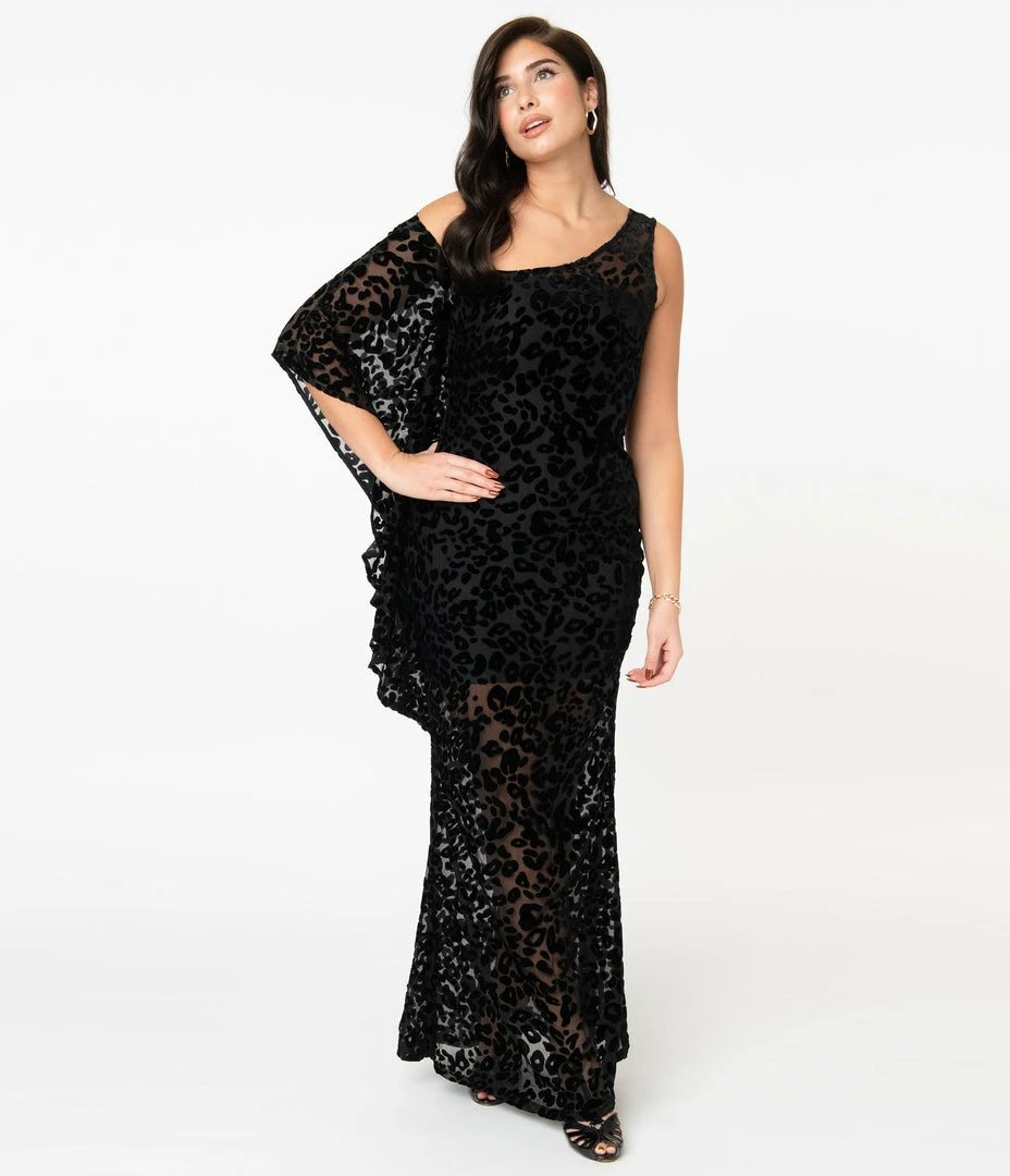 The queen of love, dears! This sultry black silhouette from Unique Vintage is crafted in a beautiful sheer Devore velvet that features a ravishing leopard pattern throughout. The Amoret Caftan is a jaw-dropping piece with an elegant scoop neckline and a charming asymmetrical design of a cascading kimono-style sleeve on the right. The fitted form is cinched with a back zipper while the sexy long skirt drops to the floor for a statuesque scene!