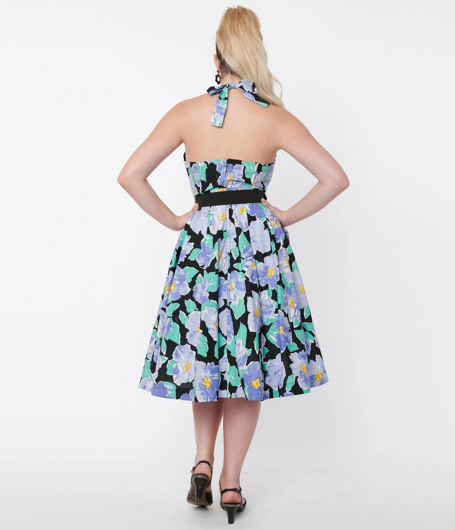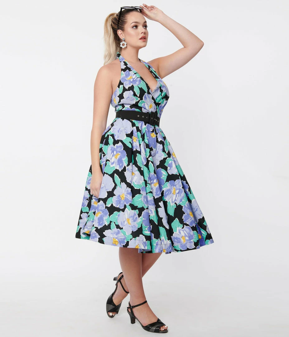 Crafted in a marvelous woven blend and cast with a fabulous array of lilac and purple florals throughout a black background. The elegant surplice halter neckline that self ties for a perfect pin-up fit while a banded waist boasts a buckle belt to nip and cinch your hourglass. The pleated swing skirt features a button up front to show off your favorite pair of shorts or capris, and outfitted with hidden side pockets and a back zipper.