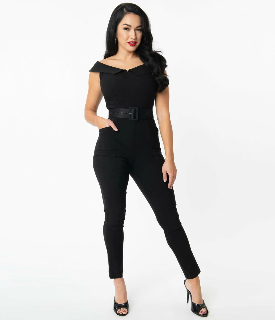 Youโre no stranger to heartbreak, dears! This jaw-dropping jumpsuit form Unique Vintage is a striking piece for turning over a new leaf, crafted in a marvelous black bengaline to flatter your feminine form. The Gillian Jumpsuit features a sultry off the shoulder neckline, embellished with a notched fold over accent that leads into Bardot sleeves while the seamed waist is cinched with a back zipper and wide belt. The skinny legs are outfitted with side pockets for a superior silhouette!