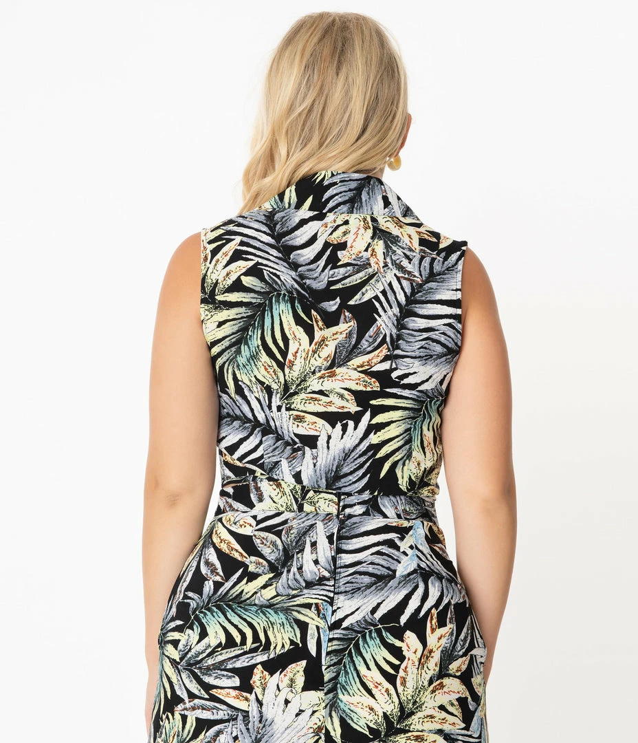 Get the beach craze started, darling! This sweet button up crop top from Unique Vintage is cast in a beautiful smooth and lightweight fabric, dancing with tropical palm leaves throughout a black backdrop. A fabulous notched lapel and darling chest pocket lend retro accent to this sleeveless separate while the front self tie adds sweet styling to your ensemble. Take the world on vacation!