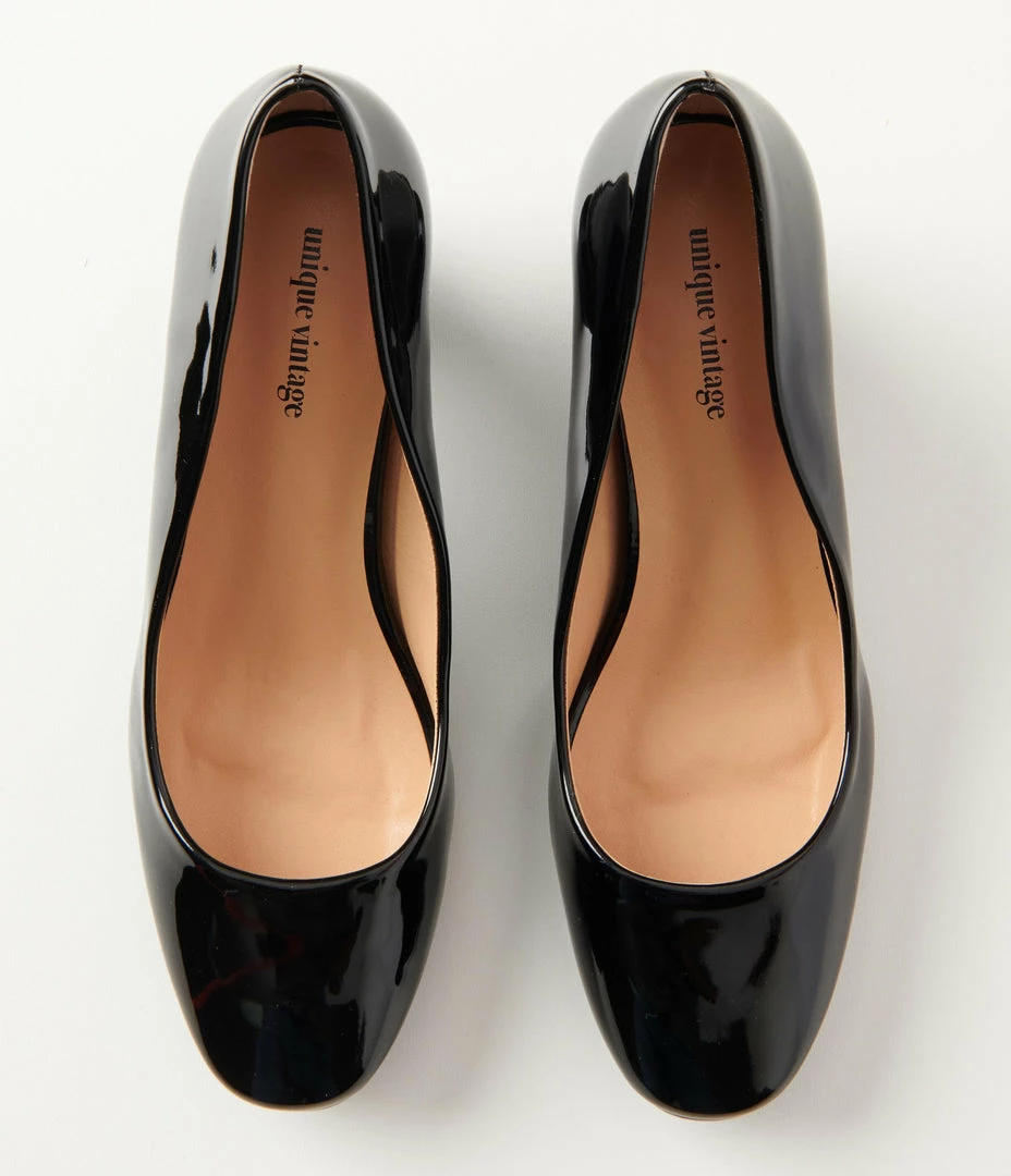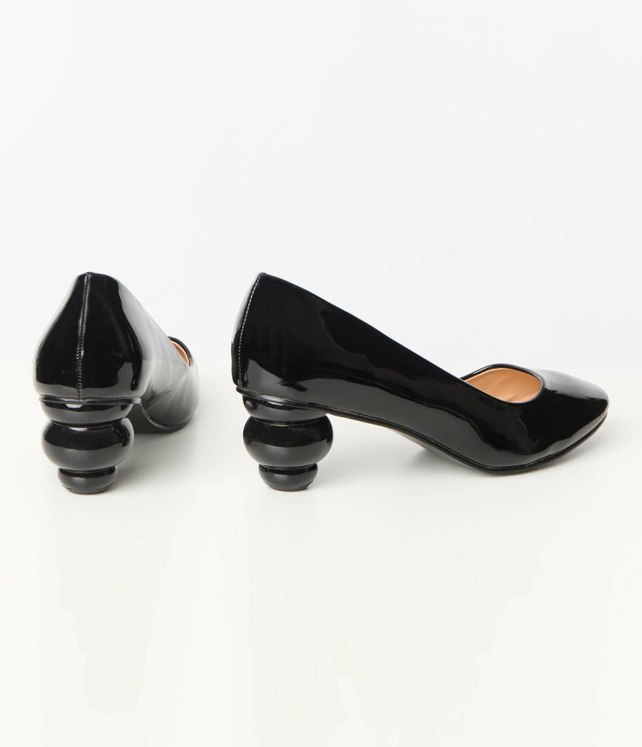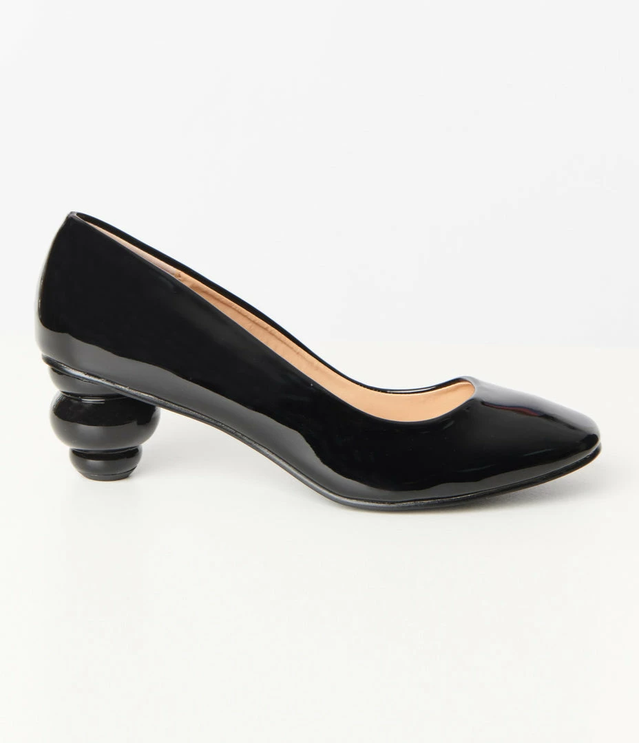 A 1950s inspired vintage dream in black patent leatherette, these pumps feature a unique 2 inch ball heel and a cushion insole for minimal tread.