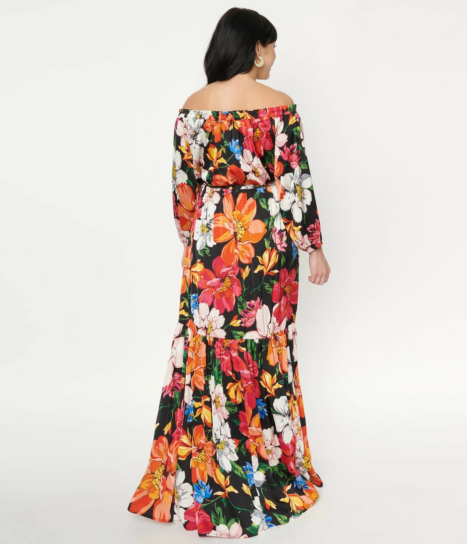 This gorgeous maxi dress is crafted in a lightweight satin style fabric that features a floral print of pink, orange, blue and white throughout a black backdrop. The off the shoulder neckline is framed by three-quarter length sleeves that drop into elastic cuffs. The elastic waist is embellished with a matching sash as the maxi skirt drops into a ruffled border.