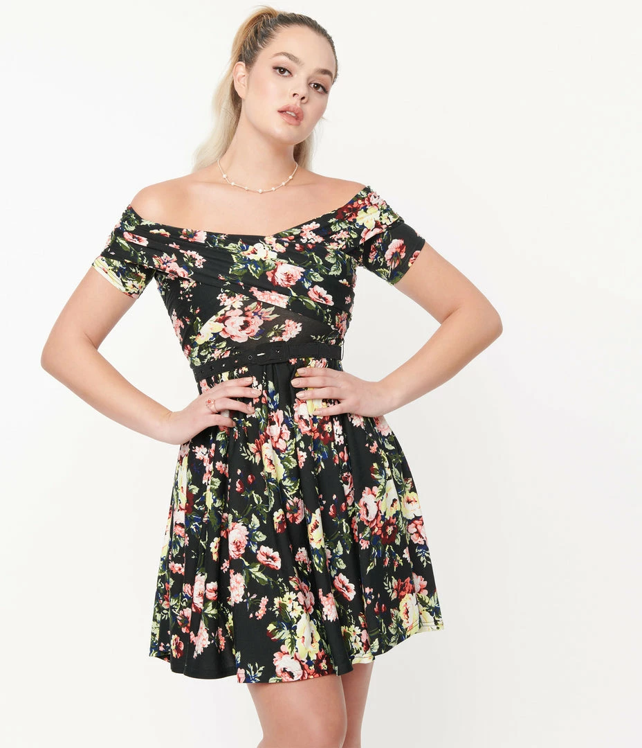 Stop and smell the roses, dolls! This enchanting fit and flare dress from Unique Vintage is crafted in a soft stretch knit blend and features roses in shades of pink throughout the black black backdrop. The sultry off the shoulder surplice neckline is framed by short sleeves that cover your upper arms. The gathered skirt is cinched in at the seamed waist with a belt, and drops playfully just above the knees, but most importantly it features hidden side pockets for a touch of modern sensibility.