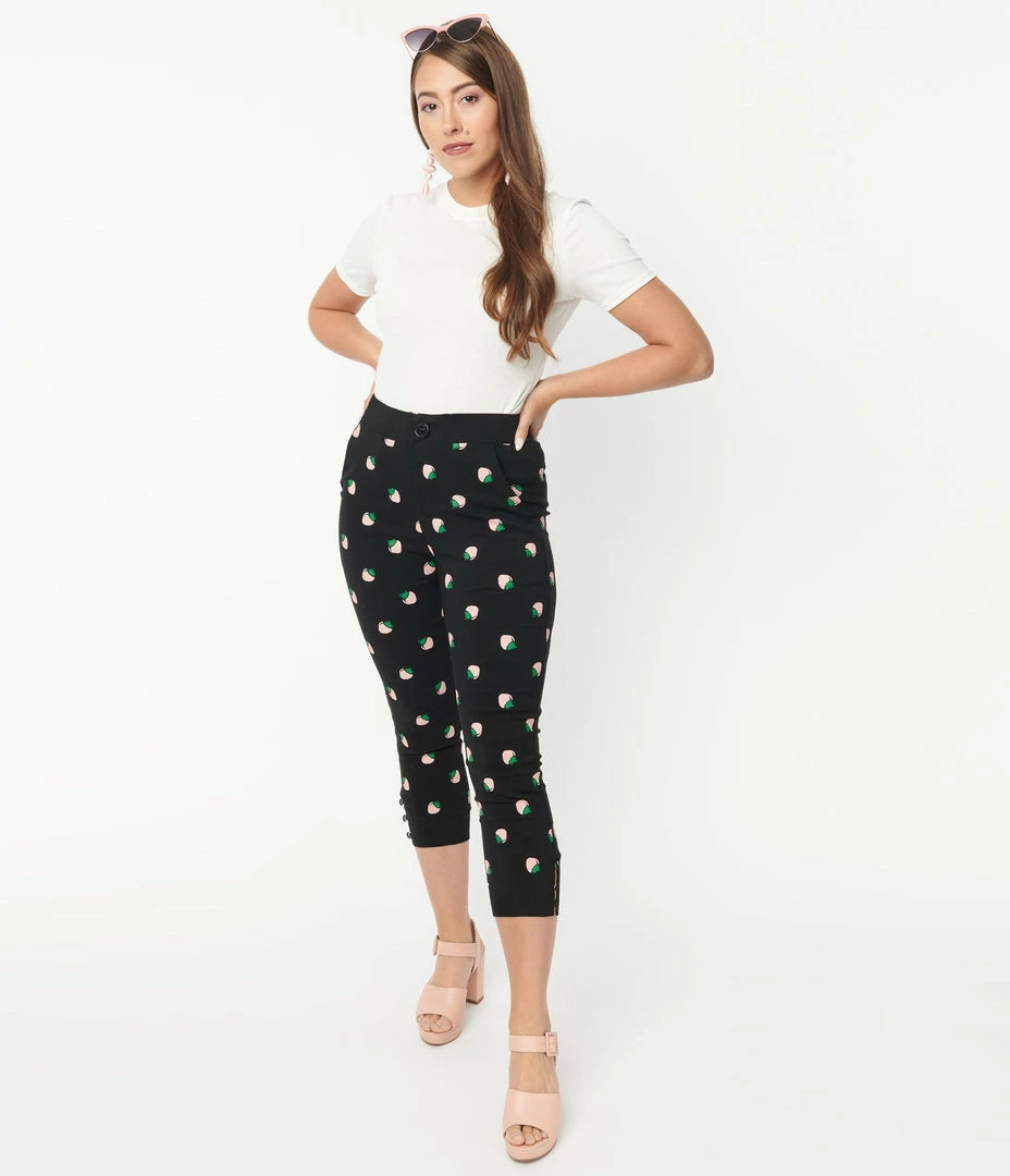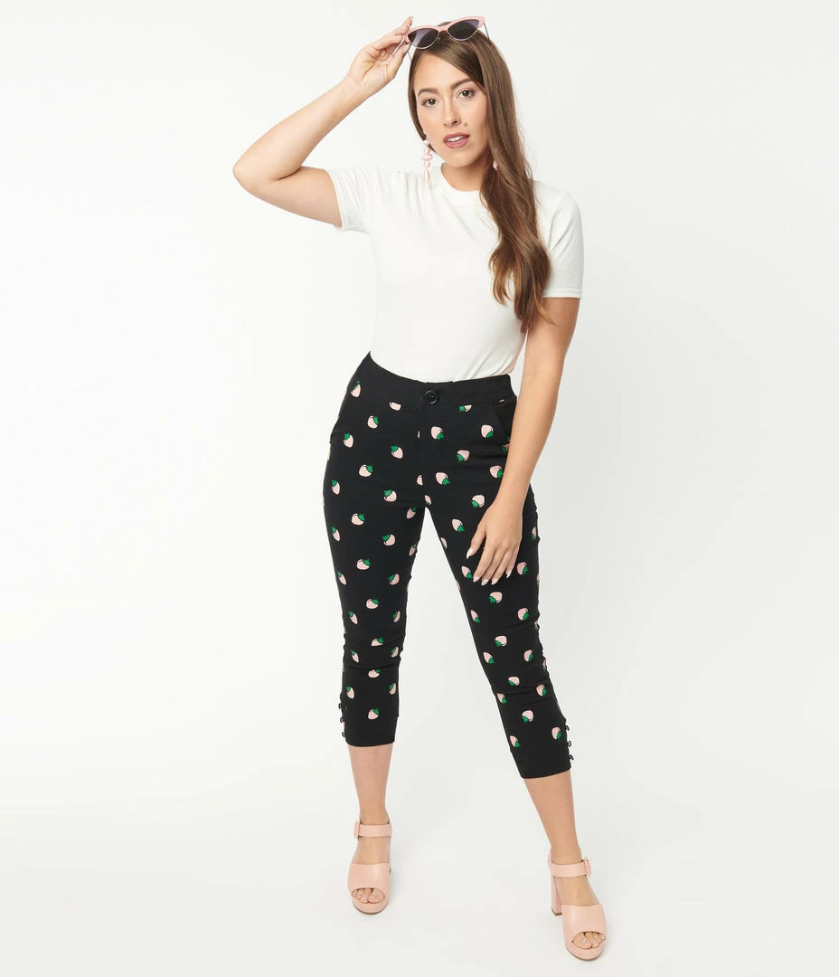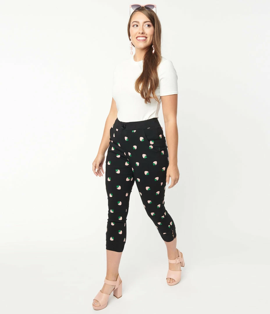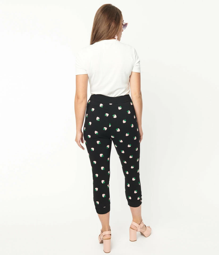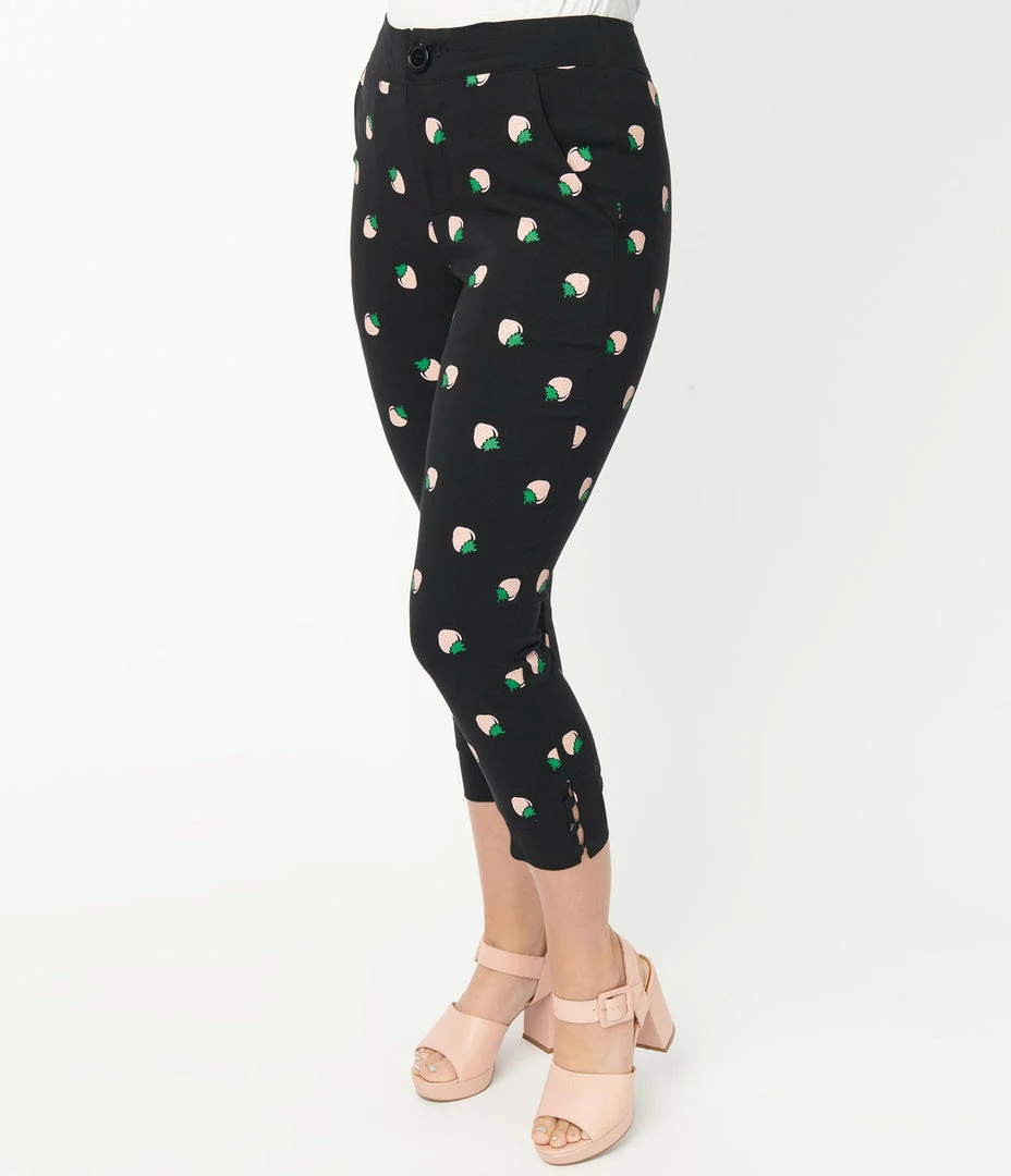 Cheap ✔️ Unique Vintage Black & Pink Strawberry Print Darienne Capris New Arrivals! ✔️