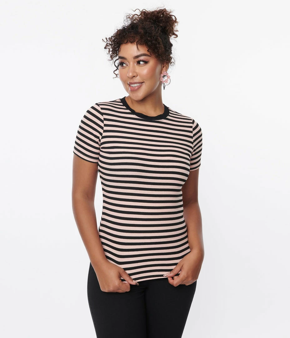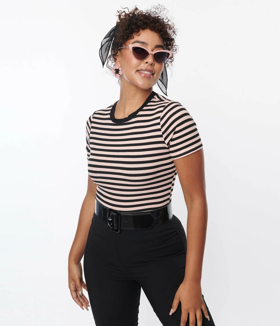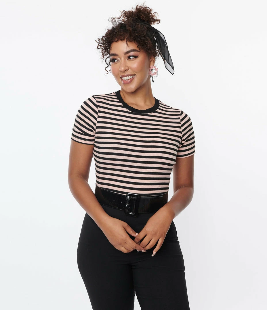 Classically mod, dolls! The Back to Basics top from Unique Vintage is crafted in a marvelous stretch knit blend and boasts a fun black and pink striped pattern throughout. The solid black crew neck is framed by short sleeves, complete with a straight hemline!