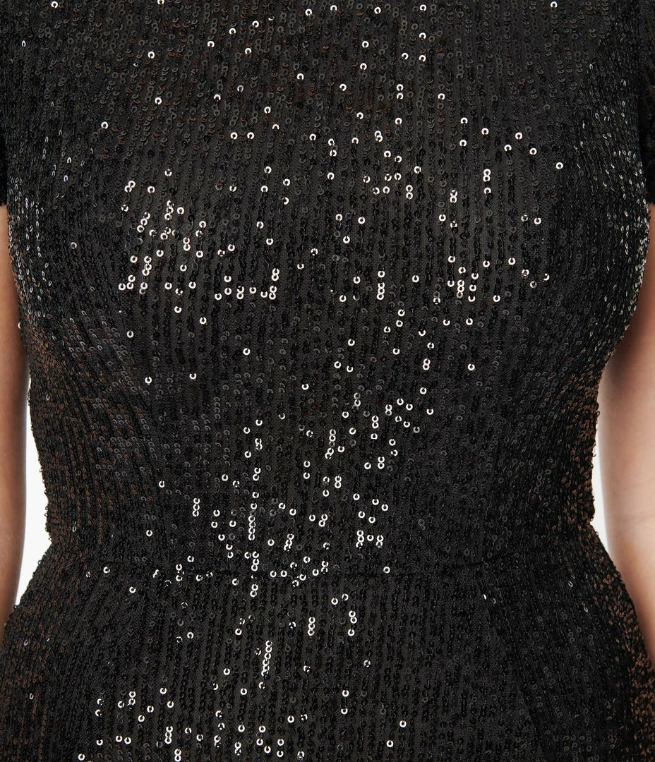 A chic pencil dress, crafted in black and dazzling sequins and outfitted with short sleeves. Complete with a back zipper and back vent.