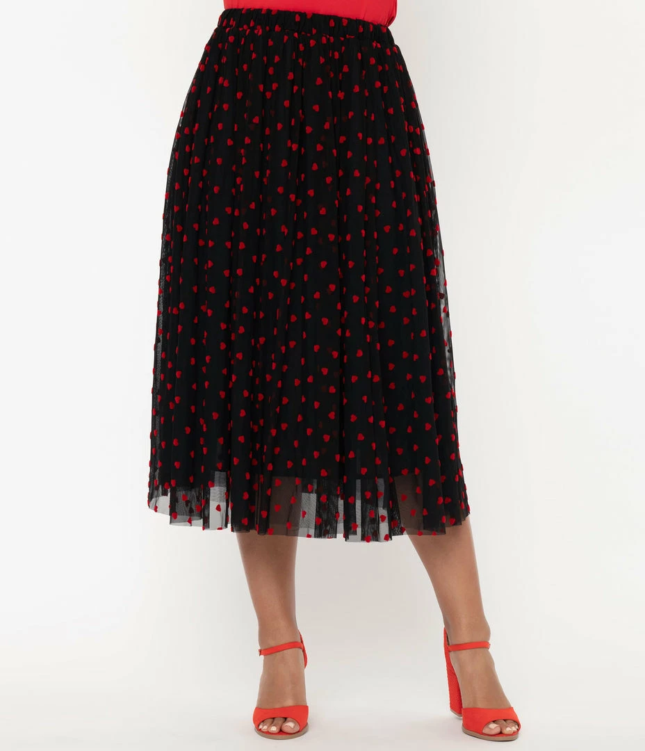 Time for some fun, darling! A brilliant piece to dazzle onlookers, the Hilty Skirt from Unique Vintage is crafted in a soft black tulle that dances with red Swiss dot hearts printed throughout. An elastic banded waist nips in your form while the straight hem drops past your knees for comfortable daydreaming!