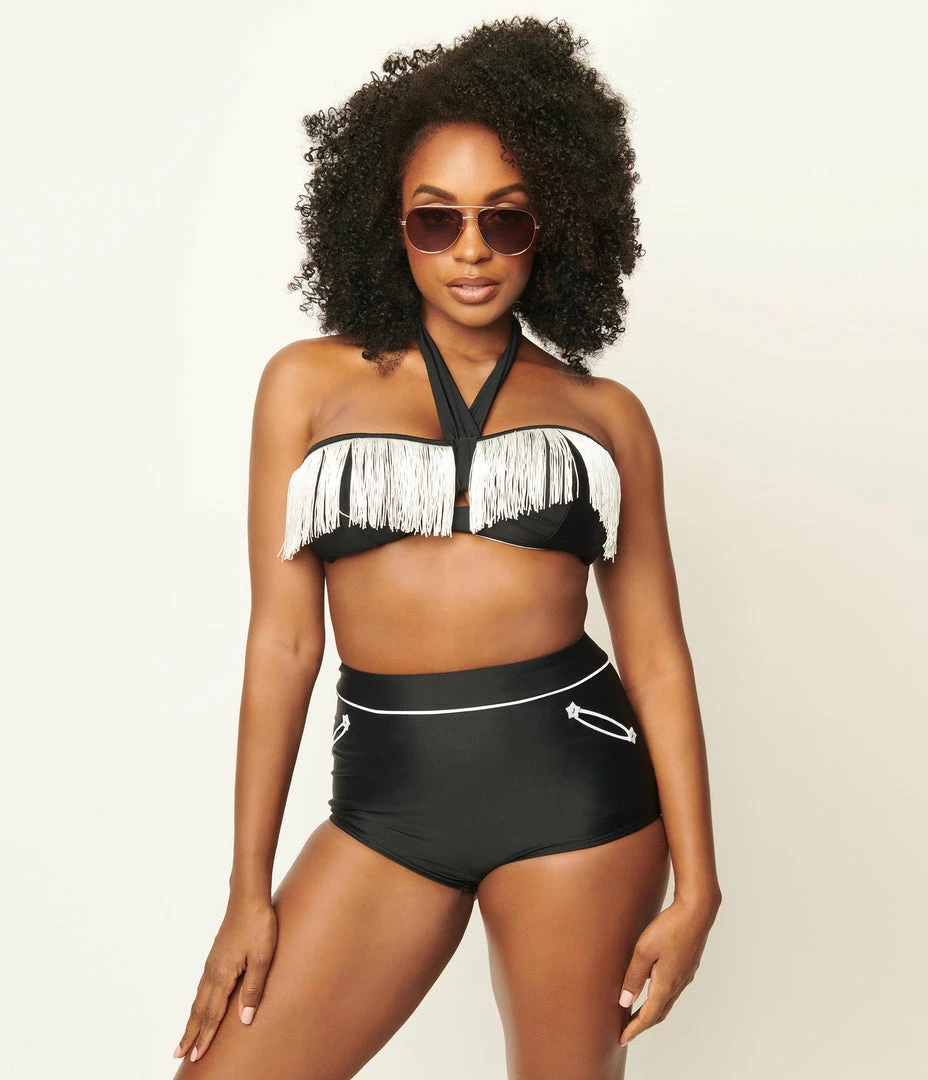 We’re dreaming of bucking broncos, dames! The plus size Mrs. Cooper Swim Bottom from Unique Vintage are a western-inspired high-waisted swim bottom cast in solid black and featuring white piping to offer plenty of vintage charm. Featuring functional side pockets, embellished with dainty western stars, these modest swim bottoms flatter your physique and honor your curves with their full-coverage back, tummy control mesh lining in the front and slimming waistband!