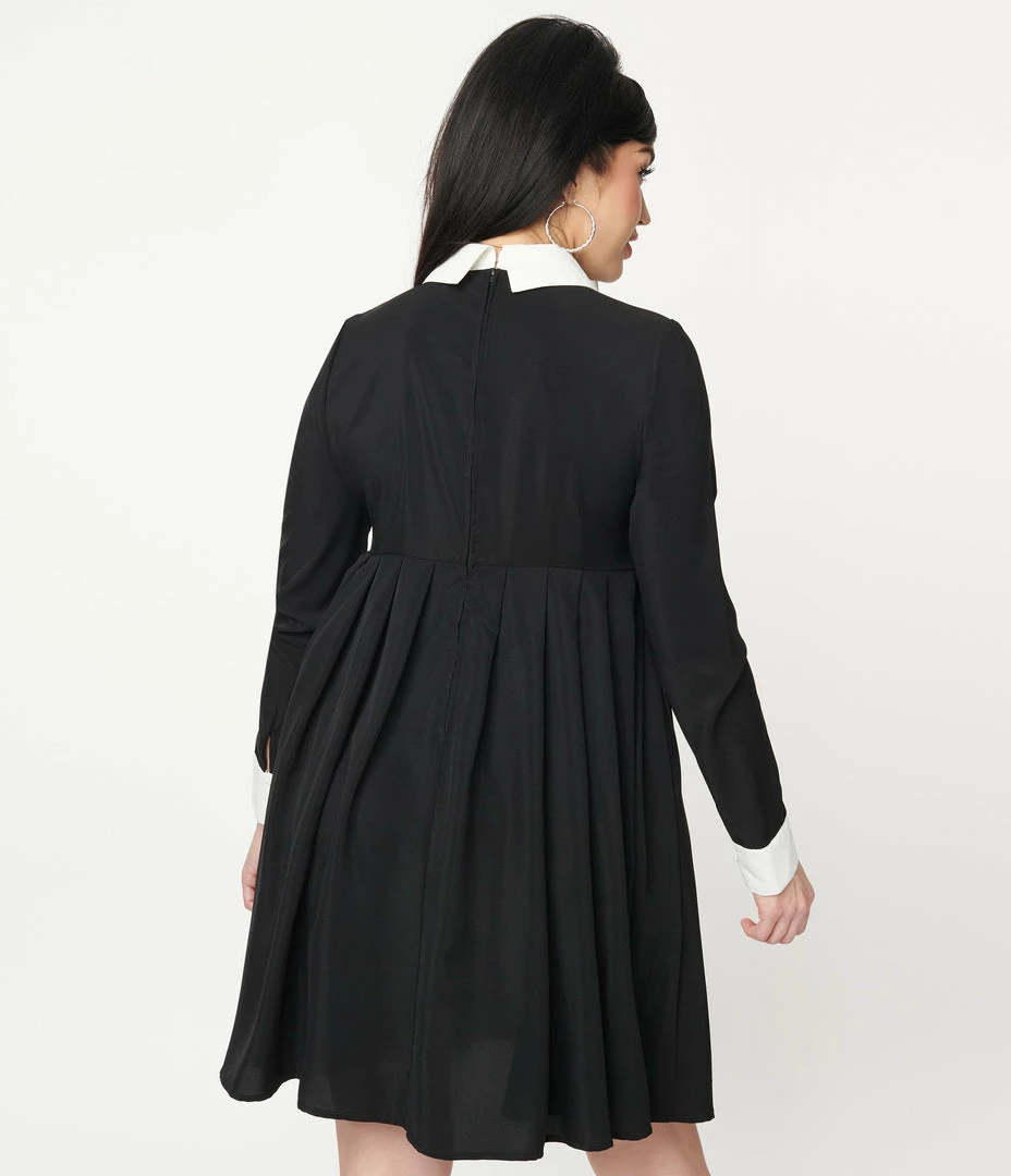 This mod inspired babydoll dress is crafted in a lightweight black crepe and boasts a solid white collar, framed by long sleeves that drop into solid white button cuffs. Outfitted with a back zipper and side pockets.